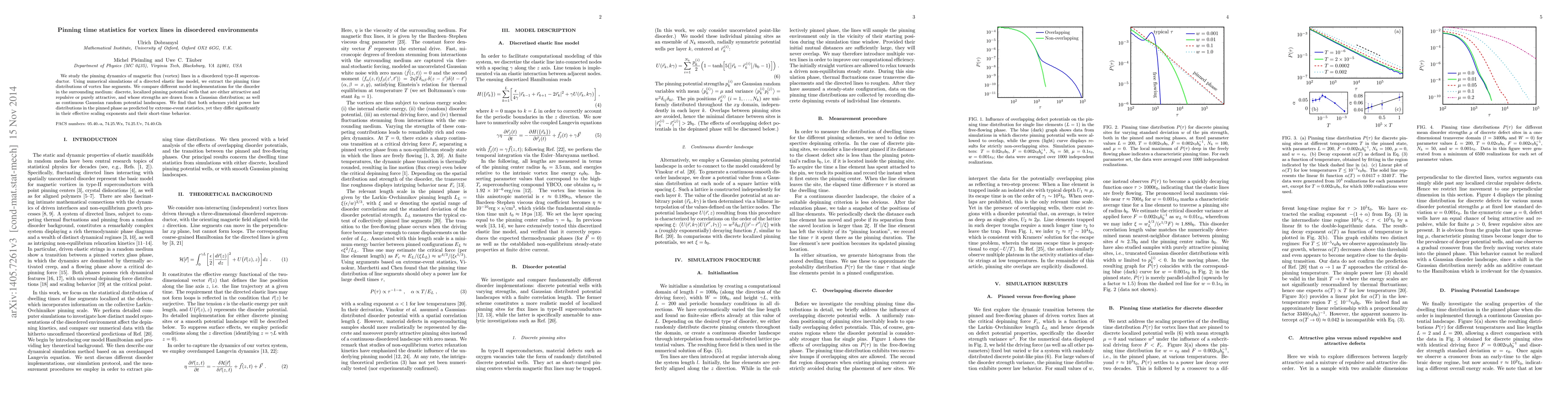 This paper investigates the dynamics of magnetic flux vortex lines in disordered superconductors using numerical simulations. It compares different disorder models, finding that both discrete and continuous disorder yield power law pinning time distributions, though with distinct scaling exponents and short-time behaviors.