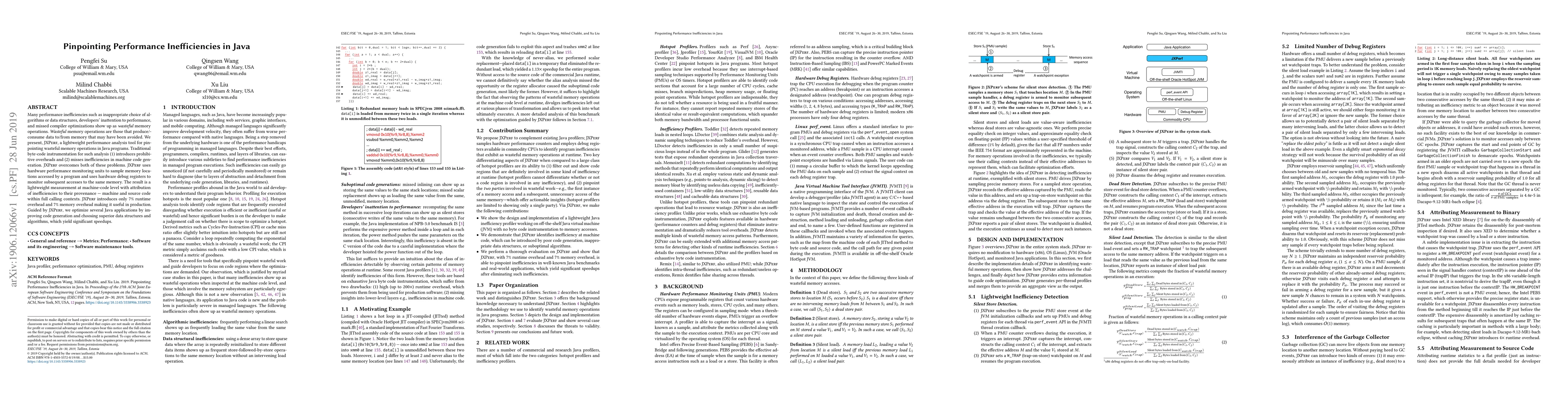 Many performance inefficiencies such as inappropriate choice of algorithms or data structures, developers' inattention to performance, and missed compiler optimizations show up as wasteful memory operations. Wasteful memory operations are those that produce/consume data to/from memory that may have been avoided. We present, JXPerf, a lightweight performance analysis tool for pinpointing wasteful memory operations in Java programs. Traditional byte-code instrumentation for such analysis (1) introduces prohibitive overheads and (2) misses inefficiencies in machine code generation. JXPerf overcomes both of these problems. JXPerf uses hardware performance monitoring units to sample memory locations accessed by a program and uses hardware debug registers to monitor subsequent accesses to the same memory. The result is a lightweight measurement at machine-code level with attribution of inefficiencies to their provenance: machine and source code within full calling contexts. JXPerf introduces only 7% runtime overhead and 7% memory overhead making it useful in production. Guided by JXPerf, we optimize several Java applications by improving code generation and choosing superior data structures and algorithms, which yield significant speedups.