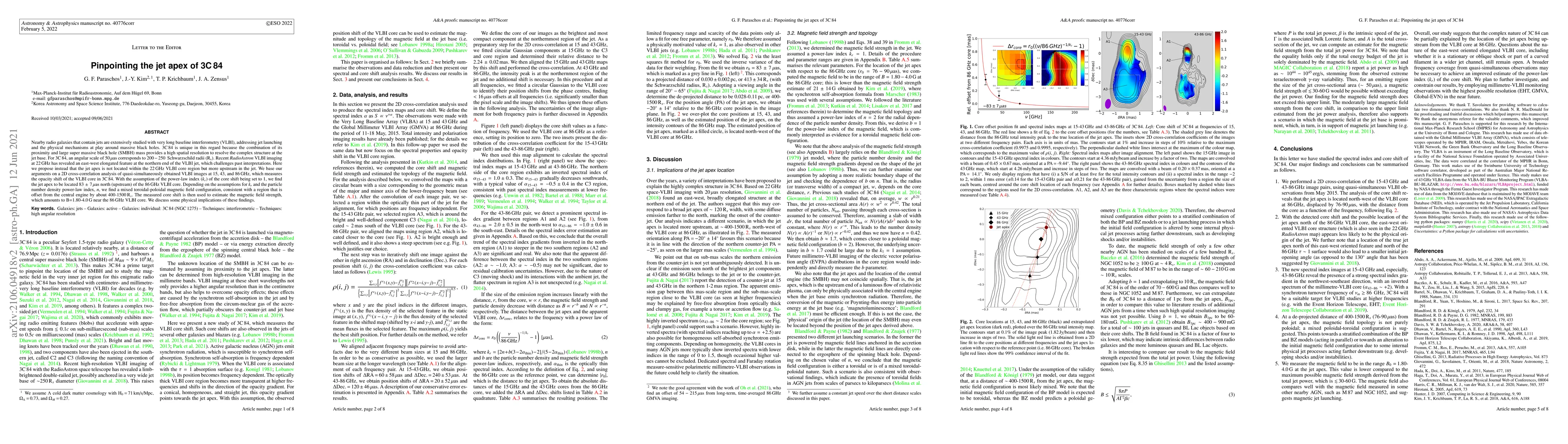 This paper proposes that the jet apex of the nearby radio galaxy 3C 84 is located upstream of the 86 GHz VLBI core, based on cross-correlation analysis of VLBI images at multiple frequencies. The findings suggest a mixed magnetic field configuration and estimate the magnetic field strength near the core.