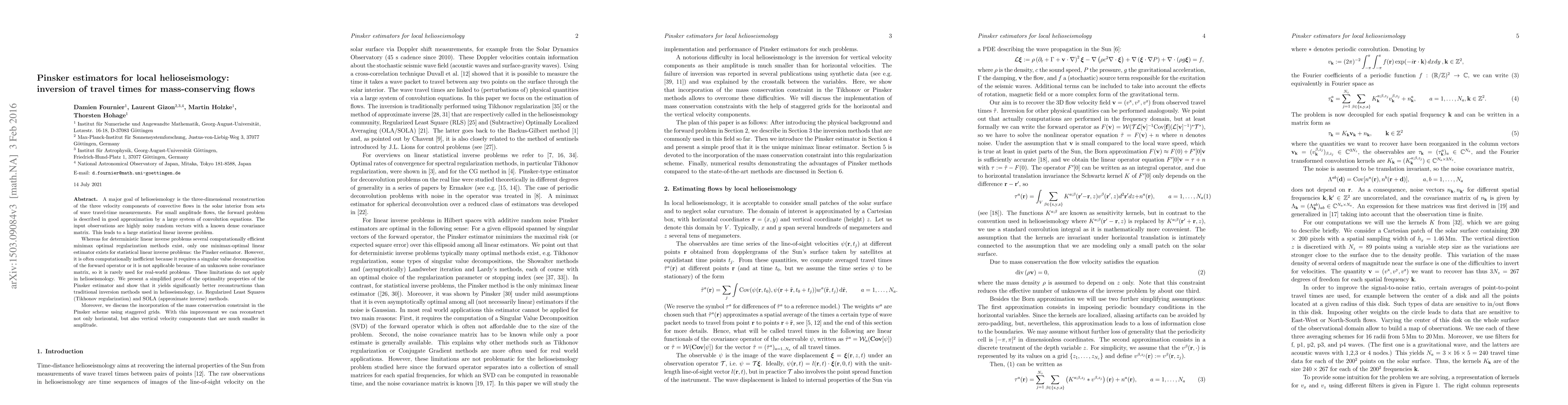 This paper presents the Pinsker estimator for reconstructing the three-dimensional velocity components of solar convective flows from noisy wave travel-time measurements in helioseismology. The Pinsker estimator, which is optimal for statistical linear inverse problems, outperforms traditional inversion methods and allows for the reconstruction of both horizontal and vertical velocity components.