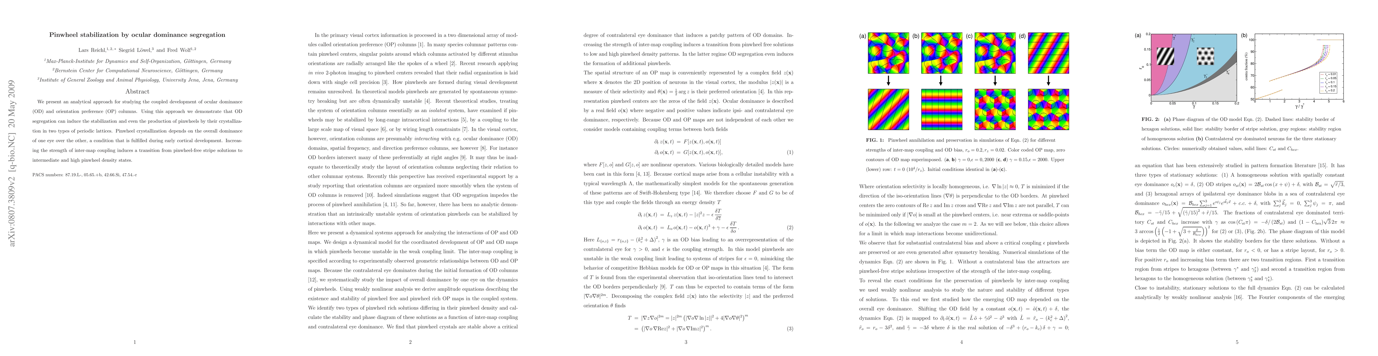 We present an analytical approach for studying the coupled development of ocular dominance and orientation preference columns. Using this approach we demonstrate that ocular dominance segregation can induce the stabilization and even the production of pinwheels by their crystallization in two types of periodic lattices. Pinwheel crystallization depends on the overall dominance of one eye over the other, a condition that is fulfilled during early cortical development. Increasing the strength of inter-map coupling induces a transition from pinwheel-free stripe solutions to intermediate and high pinwheel density states.