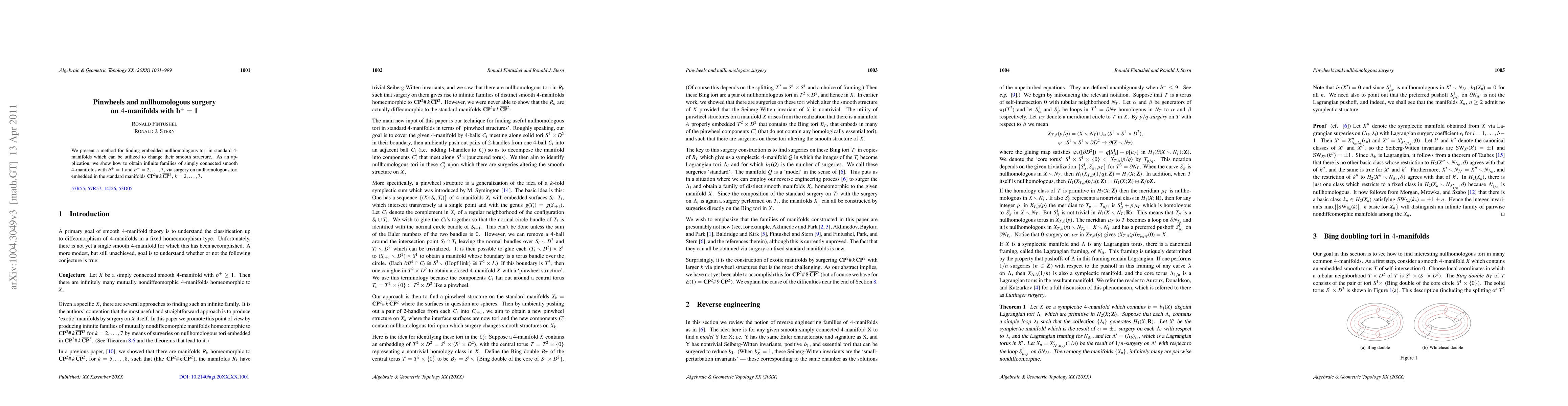 We present a method for finding embedded nullhomologous tori in standard 4-manifolds which can be utilized to change their smooth structure. As an application, we show how to obtain infinite families of simply connected smooth 4-manifolds with b^+ = 1 and b^- = 2,...,7, via surgery on nullhomologous tori embedded in the standard manifolds CP^2 # k (-CP^2), k=2,...,7.