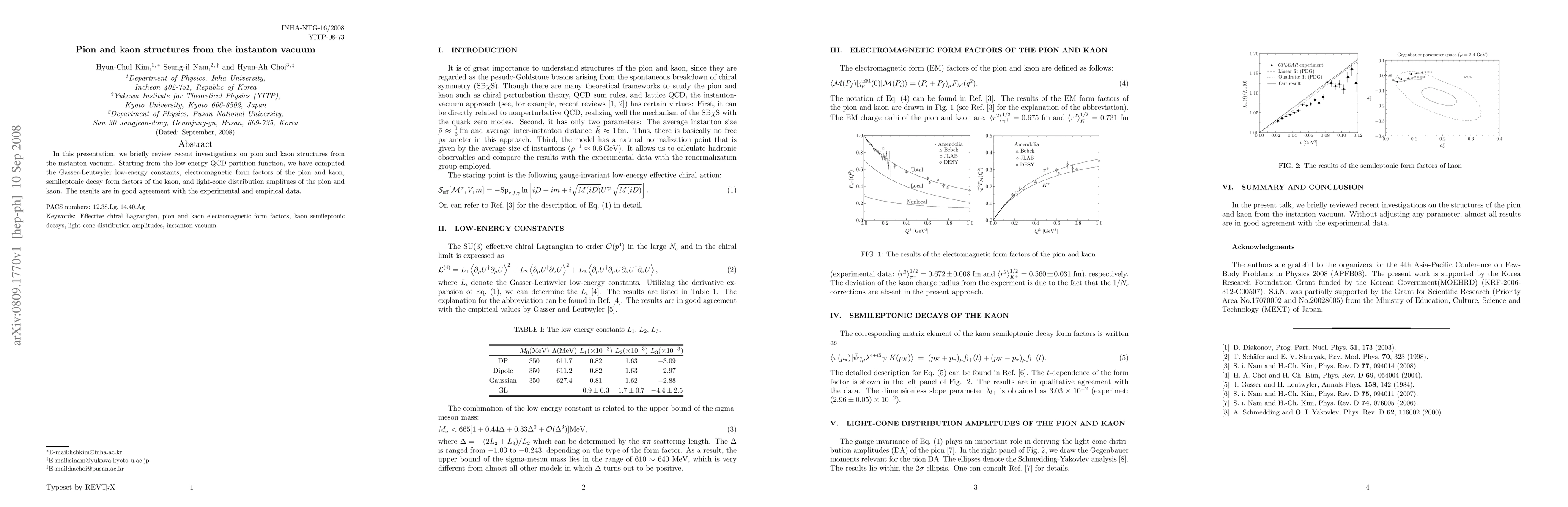 In this presentation, we briefly review recent investigations on pion and kaon structures from the instanton vacuum. Starting from the low-energy QCD partition function, we have computed the Gasser-Leutwyler low-energy constants, electromagnetic form factors of the pion and kaon, semileptonic decay form factors of the kaon, and light-cone distribution amplitues of the pion and kaon. The results are in good agreement with the experimental and empirical data.