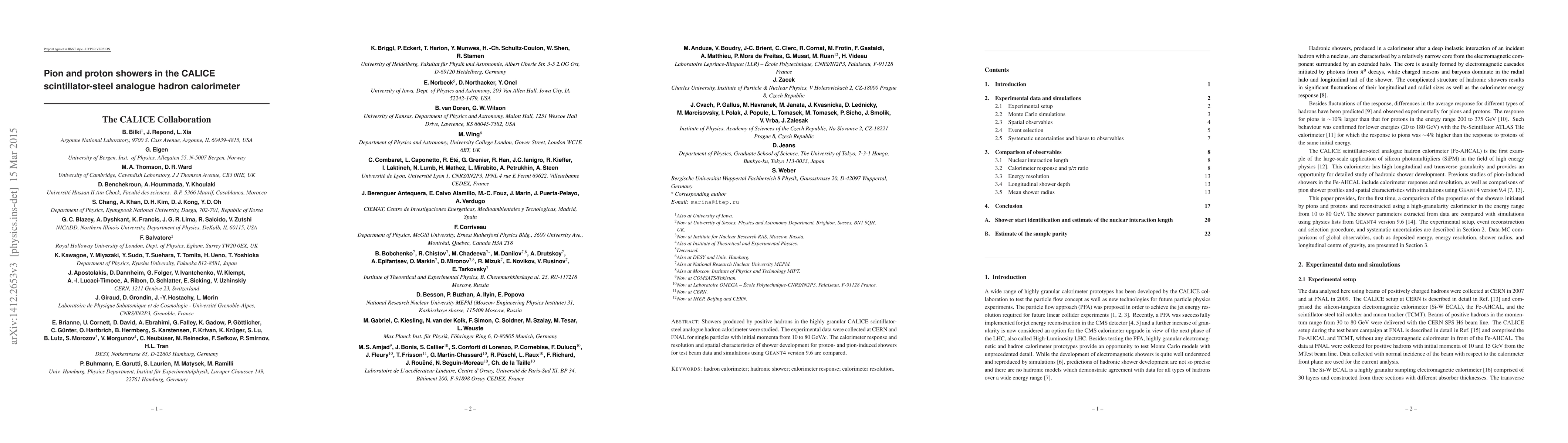 This paper investigates pion and proton showers in the CALICE scintillator-steel analogue hadron calorimeter, analyzing data from CERN and FNAL. The study compares experimental results with Geant4 simulations to assess the calorimeter's response, resolution, and spatial shower development characteristics.