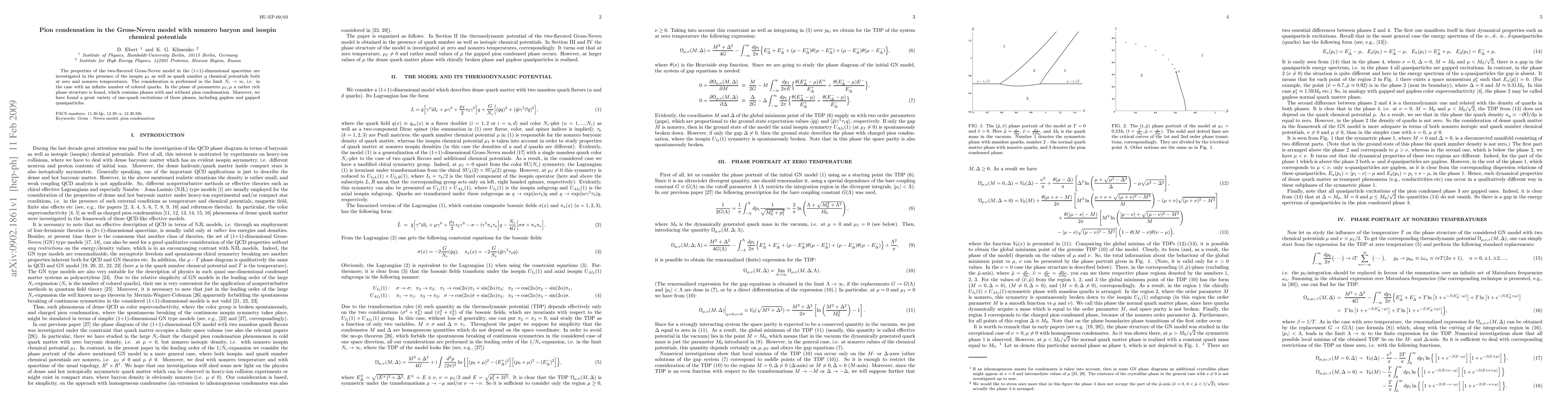 This paper investigates the phase structure of the two-flavored Gross-Neveu model under nonzero isospin and baryon chemical potentials, revealing a rich variety of phases including those with pion condensation and diverse quasiparticle excitations. The study is performed in the large $N_c$ limit, highlighting the complexity of the model's behavior at both zero and nonzero temperatures.