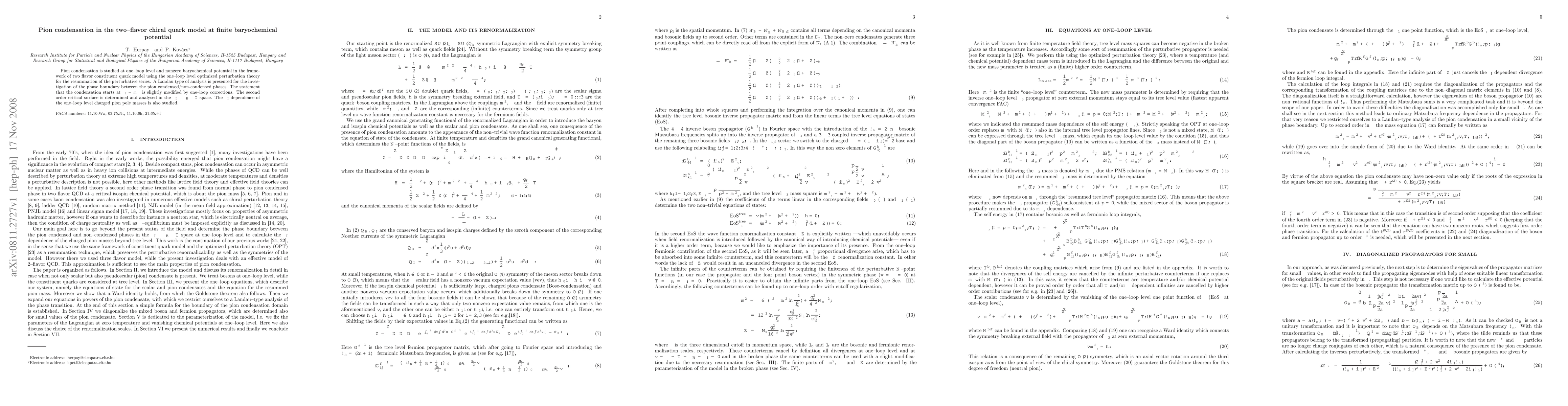 This research applies the two-flavor constituent quark model and one-loop level optimized perturbation theory to study pion condensation at nonzero baryochemical potential. It modifies the condensation initiation statement from $muI = m_{pi}$ to account for one-loop corrections, determines the second-order critical surface in the $muI-muB-T$ space, and analyzes the $muI$ dependence of charged pion pole masses.
