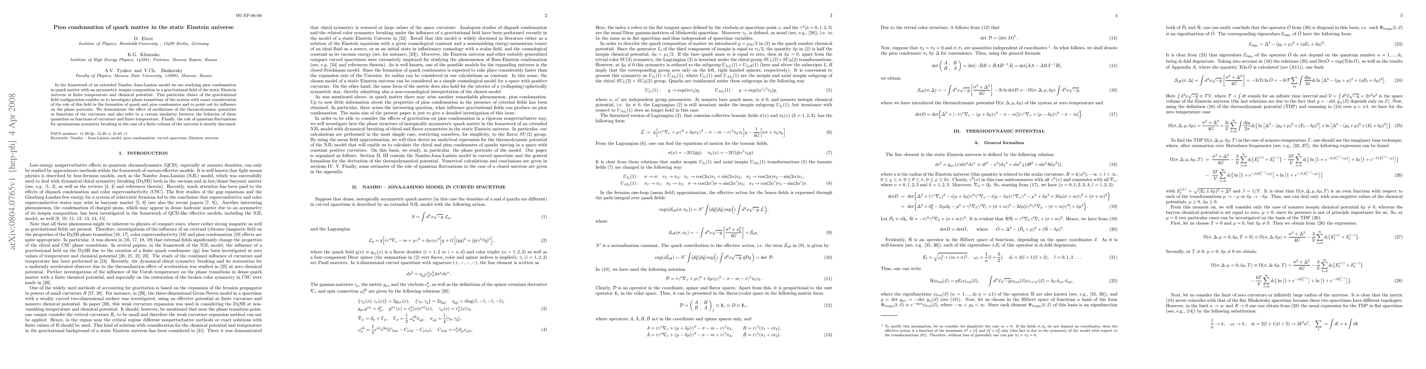 This study uses an extended Nambu-Jona-Lasinio model to examine pion condensation in quark matter with an uneven mix of isospin in a static Einstein universe's gravitational field. It highlights the field's role in quark and pion condensate formation, revealing how curvature and temperature influence phase transitions and thermodynamic quantities oscillations. The paper also briefly discusses quantum fluctuations' impact on spontaneous symmetry breaking in a finite-volume universe.