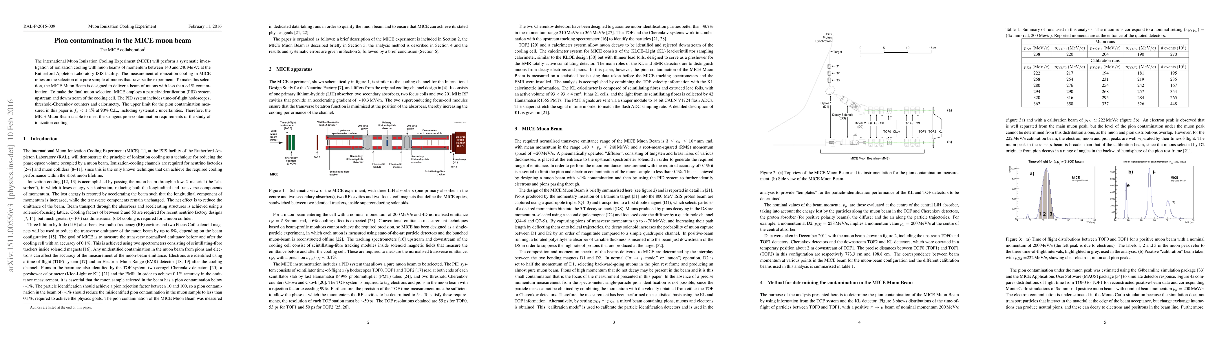 The MICE experiment aims to investigate ionization cooling using muon beams with minimal pion contamination. The study reports a pion contamination level of $f_\pi < 1.4\%$ at 90% confidence level, ensuring the beam meets the experiment's stringent purity requirements.