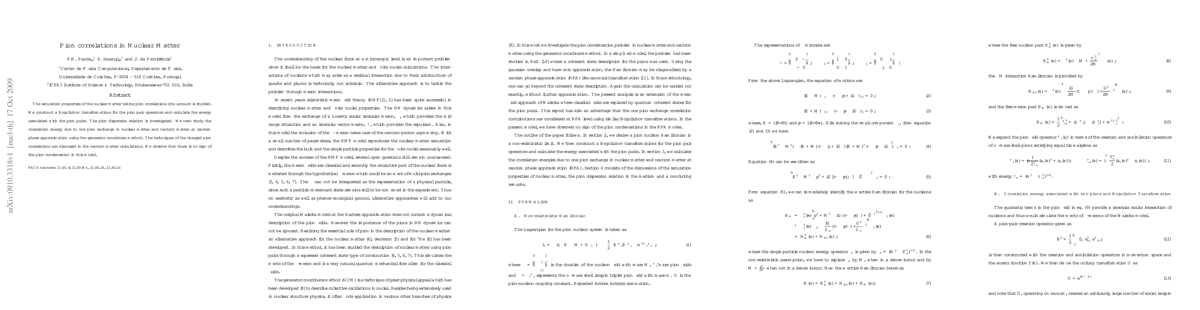 This paper investigates the saturation properties of nuclear matter by incorporating pion correlations, employing Bogoliubov transformations and the generator coordinate method to calculate the energy associated with pion pairs and their dispersion relation. The study finds no evidence of pion condensation in the model.