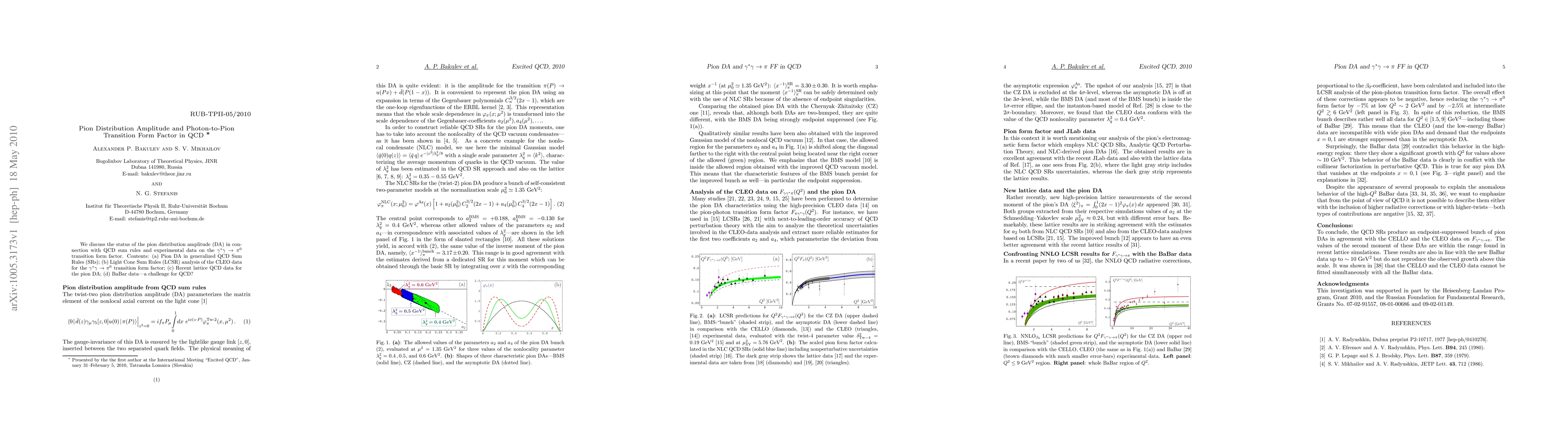 We discuss the status of the pion distribution amplitude (DA) in connection with QCD sum rules and experimental data on the $\gamma^*\gamma^\to \pi^0$ transition form factor. Contents: (a) Pion DA in generalized QCD Sum Rules (SRs); (b) Light Cone Sum Rules (LCSR) analysis of the CLEO data for the $\gamma^*\gamma\to\pi^{0}$ transition form factor; (c) Recent lattice QCD data for the pion DA; (d) BaBar data---a challenge for QCD?