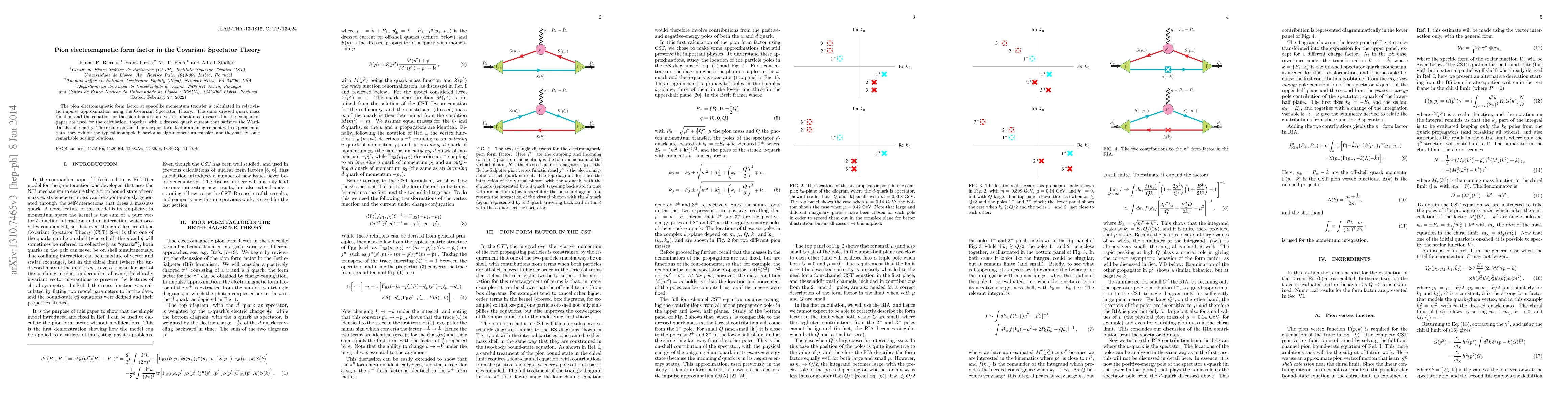 The paper calculates the pion electromagnetic form factor using the Covariant Spectator Theory, achieving agreement with experimental data and demonstrating typical monopole behavior at high momentum transfer. The results also satisfy notable scaling relations.