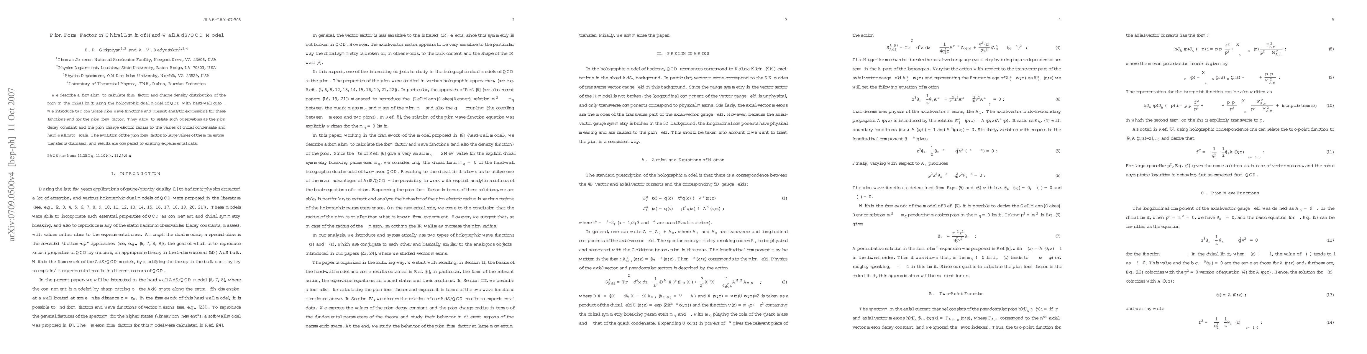 This paper develops a formalism to calculate the pion form factor and charge density distribution in the chiral limit using the hard-wall AdS/QCD model. It presents analytic expressions for pion wave functions and discusses the evolution of the pion form factor, comparing results to experimental data.