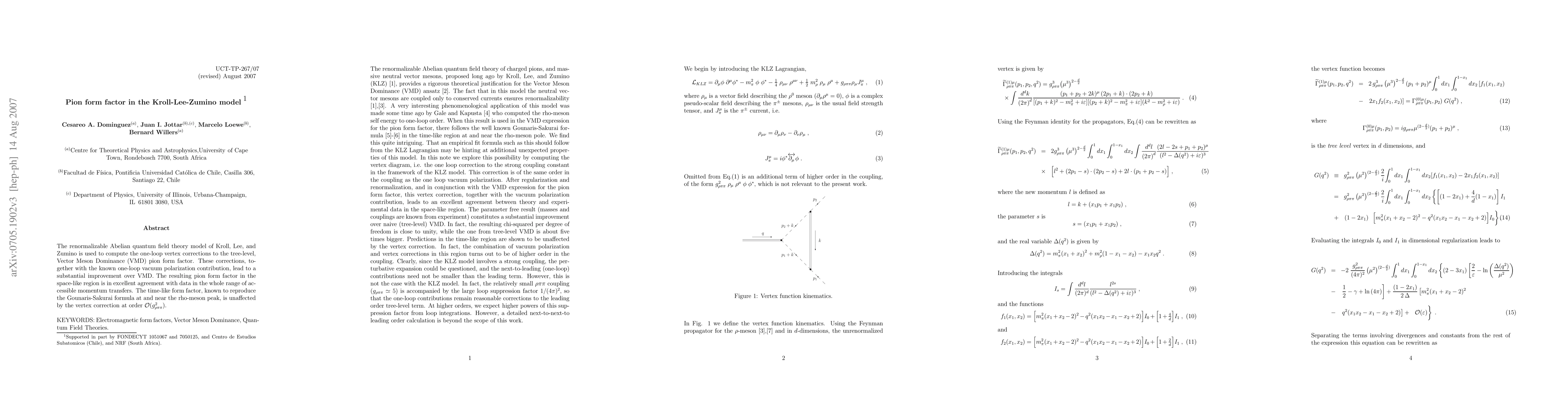 The renormalizable Abelian quantum field theory model of Kroll, Lee, and Zumino is used to compute the one-loop vertex corrections to the tree-level, Vector Meson Dominance (VMD) pion form factor. These corrections, together with the known one-loop vacuum polarization contribution, lead to a substantial improvement over VMD. The resulting pion form factor in the space-like region is in excellent agreement with data in the whole range of accessible momentum transfers. The time-like form factor, known to reproduce the Gounaris-Sakurai formula at and near the rho-meson peak, is unaffected by the vertex correction at order $\cal{O}$$(g_\rpp^2)$.