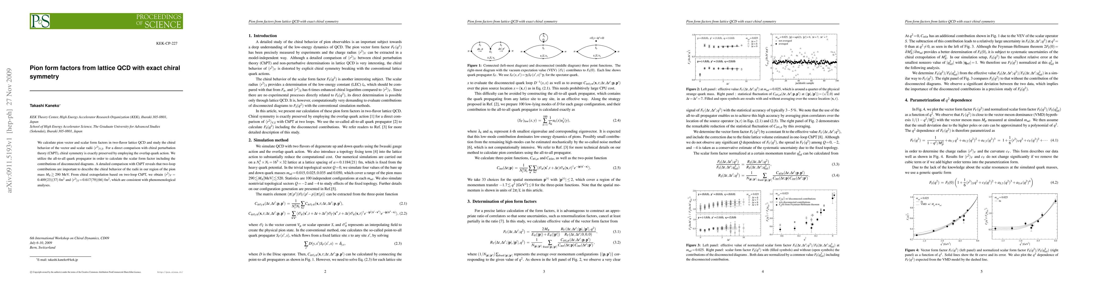 This study calculates pion vector and scalar form factors using lattice QCD with exact chiral symmetry, revealing important two-loop contributions for describing chiral behavior. Results for the vector and scalar radii are consistent with phenomenological analyses and provide insights into the pion's structure.