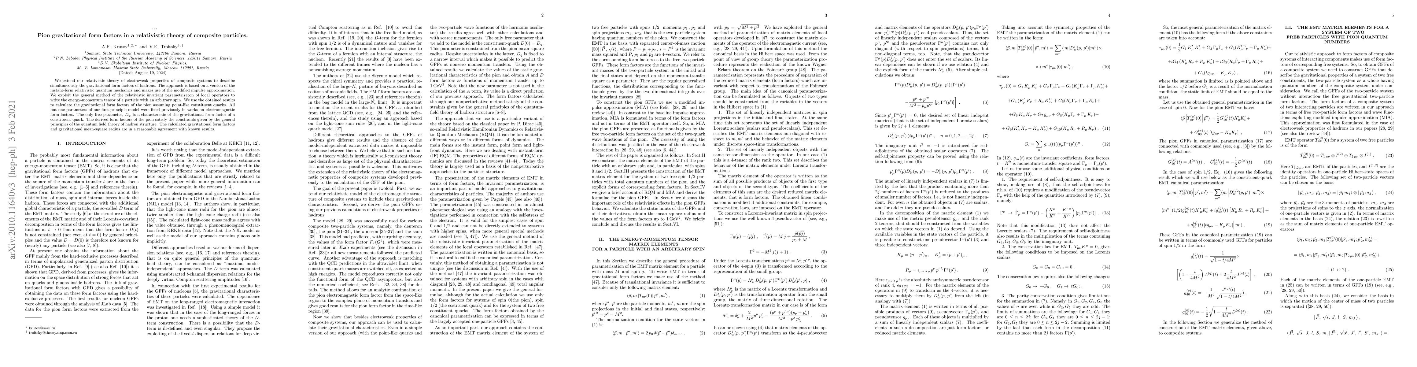 We extend our relativistic theory of electroweak properties of composite systems to describe simultaneously the gravitational form factors of hadrons. The approach is based on a version of the instant-form relativistic quantum mechanics and makes use of the modified impulse approximation. We exploit the general method of the relativistic invariant parametrizaton of local operators to write the energy-momentum tensor of a particle with an arbitrary spin. We use the obtained results to calculate the gravitational form factors of the pion assuming point-like constituent quarks. All but one parameters of our first-principle model were fixed previously in works on electromagnetic form factors. The only free parameter, $D_{q}$, is a characteristic of the gravitational form factor of a constituent quark. The derived form factors of the pion satisfy the constraints given by the general principles of the quantum field theory of hadron structure. The calculated gravitational form factors and gravitational mean-square radius are in a reasonable agreement with known results.
