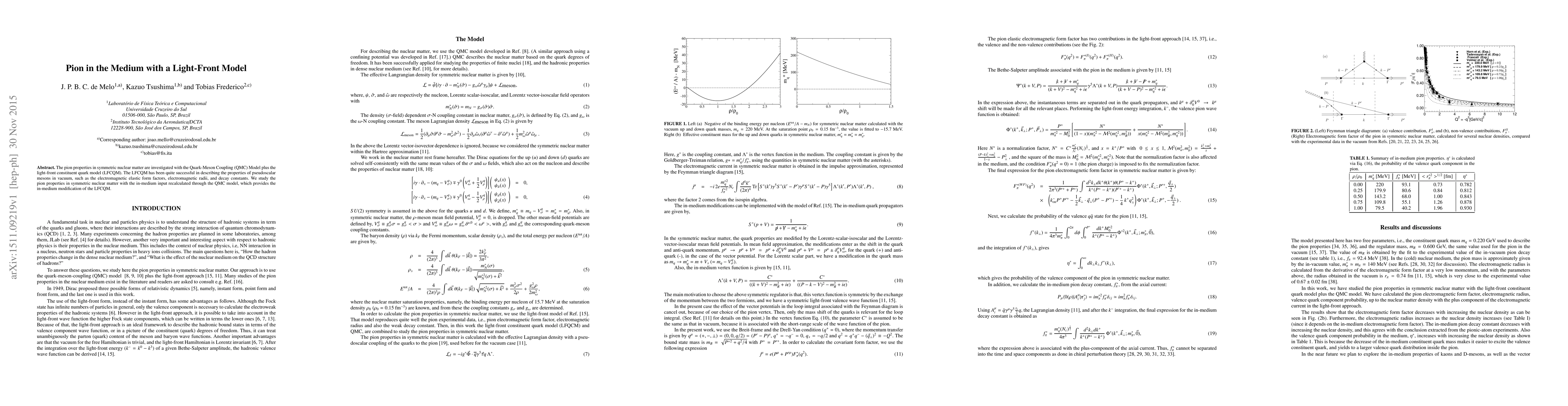 This paper investigates pion properties in symmetric nuclear matter using the Quark-Meson Coupling Model combined with the light-front constituent quark model. The study focuses on how the in-medium environment modifies pion characteristics through the QMC model.