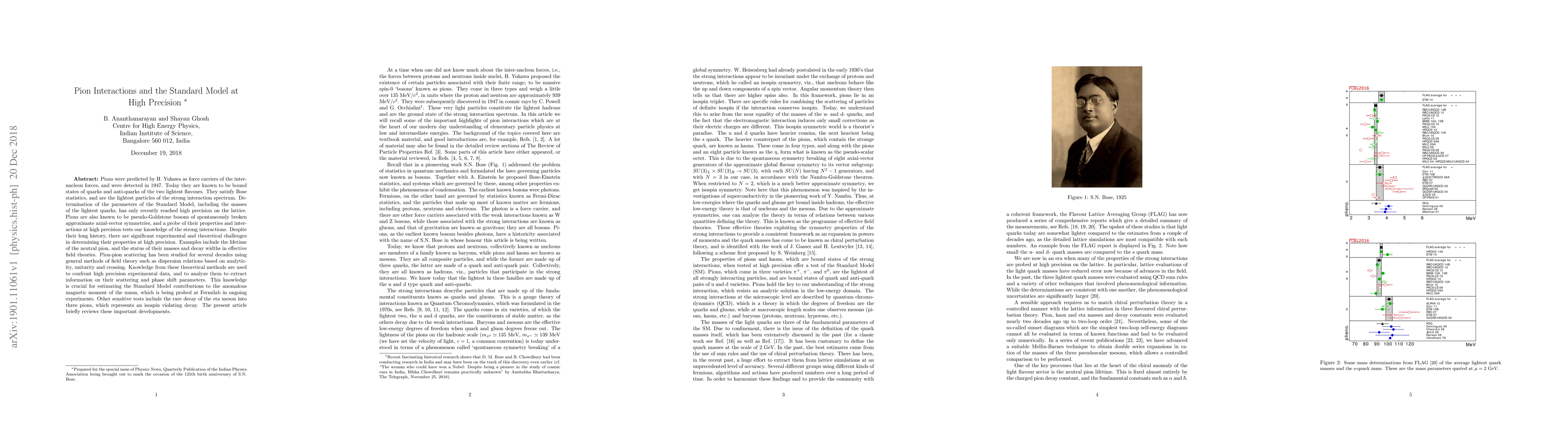 Pions were predicted by H. Yukawa as force carriers of the inter-nucleon forces, and were detected in 1947. Today they are known to be bound states of quarks and anti-quarks of the two lightest flavours. They satisfy Bose statistics, and are the lightest particles of the strong interaction spectrum. Determination of the parameters of the Standard Model, including the masses of the lightest quarks, has only recently reached high precision on the lattice. Pions are also known to be pseudo-Goldstone bosons of spontaneously broken approximate axial-vector symmetries, and a probe of their properties and interactions at high precision tests our knowledge of the strong interactions. While also being a probe of the solution of the strong interactions on the computer, which is known as lattice gauge theory. Despite their long history, there are significant experimental and theoretical challenges in determining their properties at high precision. Examples include the lifetime of the neutral pion, and the status of their masses and decay widths in effective field theories. Pion-pion scattering has been studied for several decades using general methods of field theory such as dispersion relations based on analyticity, unitarity and crossing. Knowledge from these theoretical methods are used to confront high precision experimental data, and to analyze them to extract information on their scattering and phase shift parameters. This knowledge is crucial for estimating the Standard Model contributions to the anomalous magnetic moment of the muon, which is being probed at Fermilab in ongoing experiments. Other sensitive tests include the rare decay of the eta meson into three pions, which represents an isospin violating decay. The present article briefly reviews these important developments.