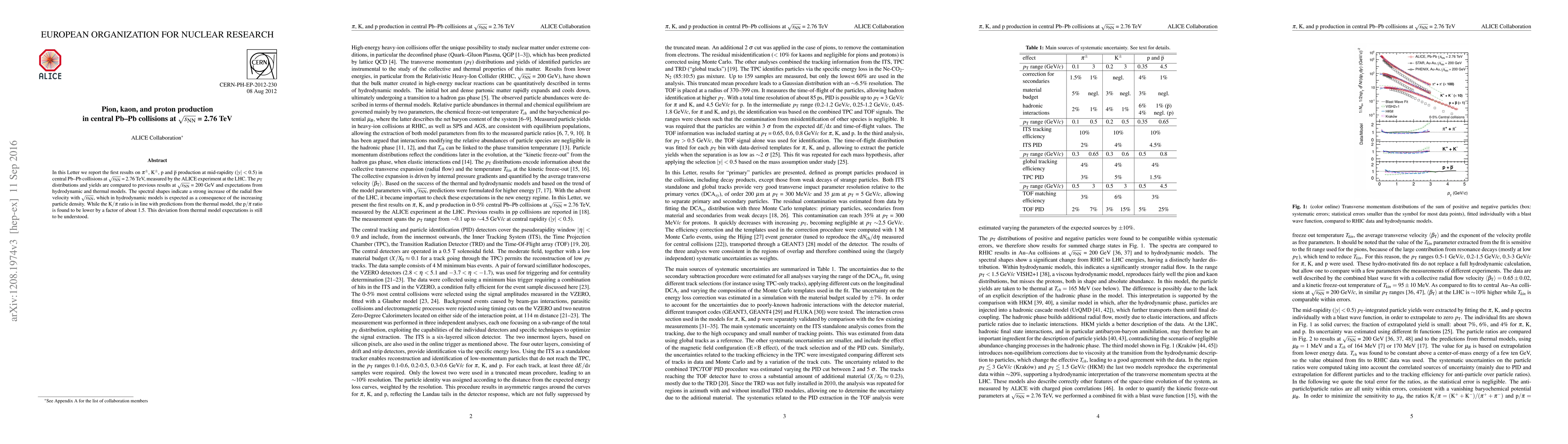 This paper reports on pion, kaon, and proton production in central Pb-Pb collisions at 2.76 TeV, revealing a strong increase in radial flow velocity with energy compared to lower energies. The observed p/π ratio deviates from thermal model predictions, indicating an unresolved discrepancy.
