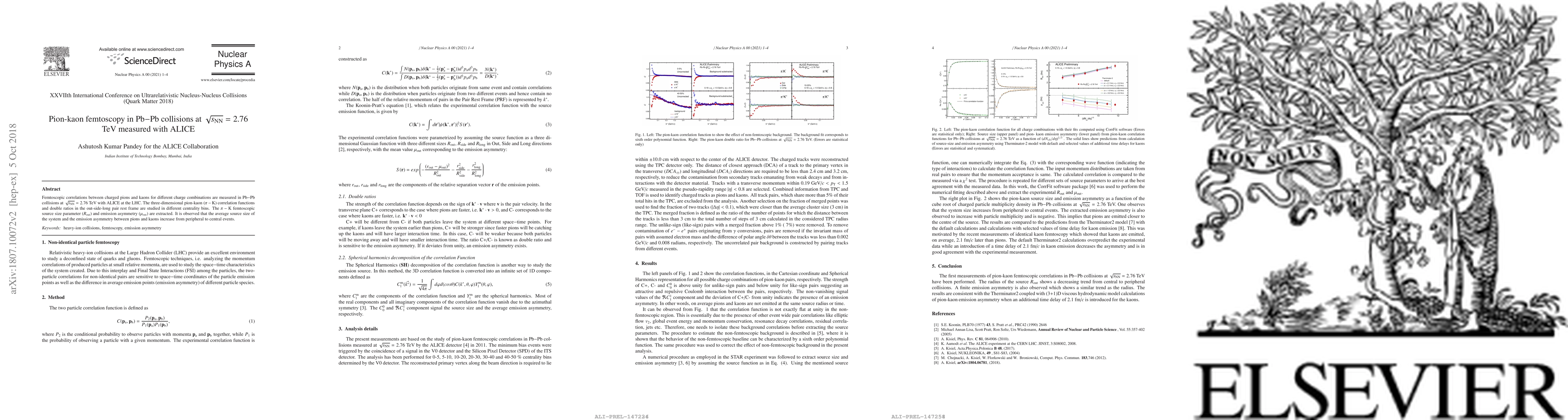 This study measures femtoscopic correlations between pions and kaons in Pb-Pb collisions at 2.76 TeV using ALICE, revealing that the average source size and emission asymmetry increase from peripheral to central events. The analysis focuses on three-dimensional correlation functions and double ratios in various centrality bins.