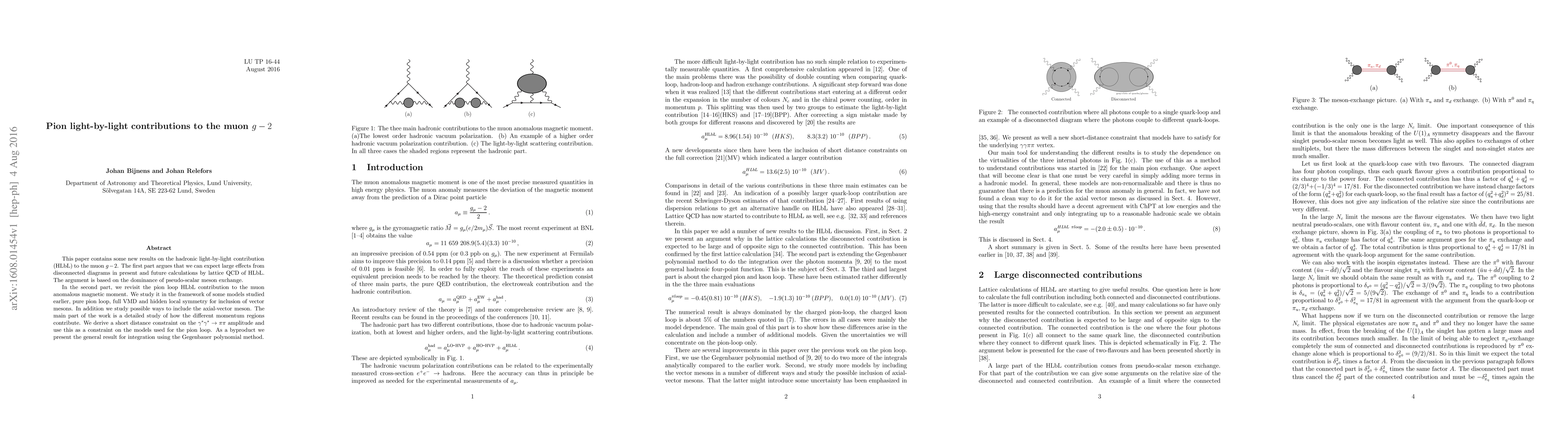 This paper contains some new results on the hadronic light-by-light contribution (HLbL) to the muon $g-2$. The first part argues that we can expect large effects from disconnected diagrams in present and future calculations by lattice QCD of HLbL. The argument is based on the dominance of pseudo-scalar meson exchange. In the second part, we revisit the pion loop HLbL contribution to the muon anomalous magnetic moment. We study it in the framework of some models studied earlier, pure pion loop, full VMD and hidden local symmetry for inclusion of vector mesons. In addition we study possible ways to include the axial-vector meson. The main part of the work is a detailed study of how the different momentum regions contribute. We derive a short distance constraint on the $\gamma^*\gamma^*\to\pi\pi$ amplitude and use this as a constraint on the models used for the pion loop. As a byproduct we present the general result for integration using the Gegenbauer polynomial method.