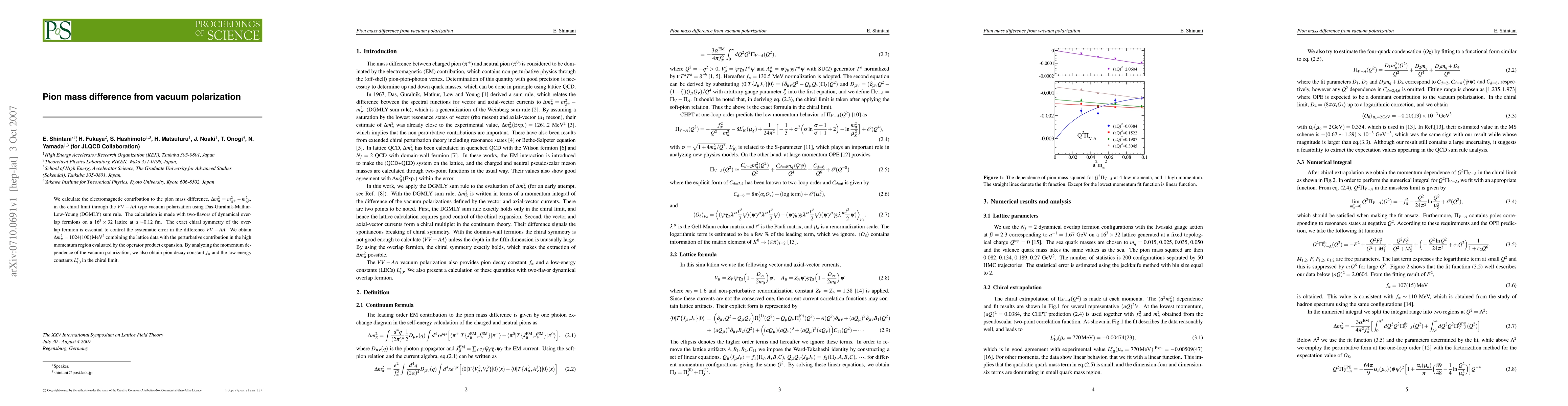 We calculate the electromagnetic contribution to the pion mass difference, $\Delta m^2_\pi=m^2_{\pi^+}-m^2_{\pi^0}$, in the chiral limit through the $VV-AA$ type vacuum polarization using Das-Guralnik-Mathur-Low-Young (DGMLY) sum rule. The calculation is made with two-flavors of dynamical overlap fermions on a $16^3\times 32$ lattice at $a\sim$0.12 fm. The exact chiral symmetry of the overlap fermion is essential to control the systematic error in the difference $VV-AA$. We obtain $\Delta m_\pi^2 = 1024(100) {\rm MeV^2}$ combining the lattice data with the perturbative contribution in the high momentum region evaluated by the operator product expansion. By analyzing the momentum dependence of the vacuum polarization, we also obtain pion decay constant $f_\pi$ and the low-energy constants $L_{10}^r$ in the chiral limit.