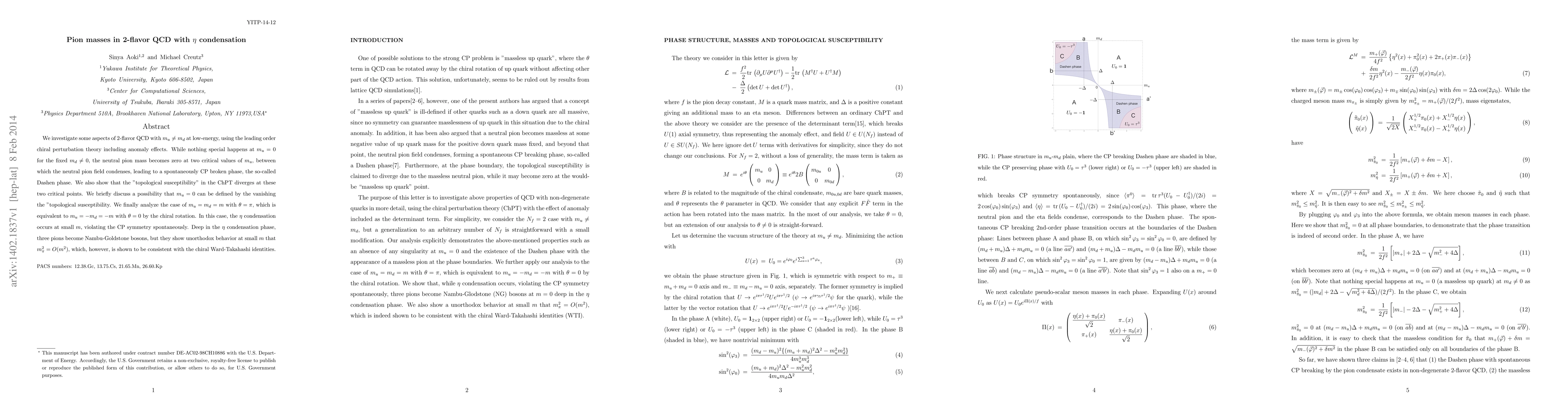 We investigate some aspects of 2-flavor QCD with $m_u\not= m_d$ at low-energy, using the leading order chiral perturbation theory including anomaly effects. While nothing special happens at $m_u=0$ for the fixed $m_d\not=0$, the neutral pion mass becomes zero at two critical values of $m_u$, between which the neutral pion field condenses, leading to a spontaneously CP broken phase, the so-called Dashen phase. We also show that the "topological susceptibility" in the ChPT diverges at these two critical points. We briefly discuss a possibility that $m_u=0$ can be defined by the vanishing the "topological susceptibility. We finally analyze the case of $m_u=m_d=m$ with $\theta=\pi$, which is equivalent to $m_u= - m_d=-m$ with $\theta = 0$ by the chiral rotation. In this case, the $\eta$ condensation occurs at small $m$, violating the CP symmetry spontaneously. Deep in the $\eta$ condensation phase, three pions become Nambu-Goldstone bosons, but they show unorthodox behavior at small $m$ that $m_\pi^2 = O(m^2)$, which, however, is shown to be consistent with the chiral Ward-Takahashi identities.