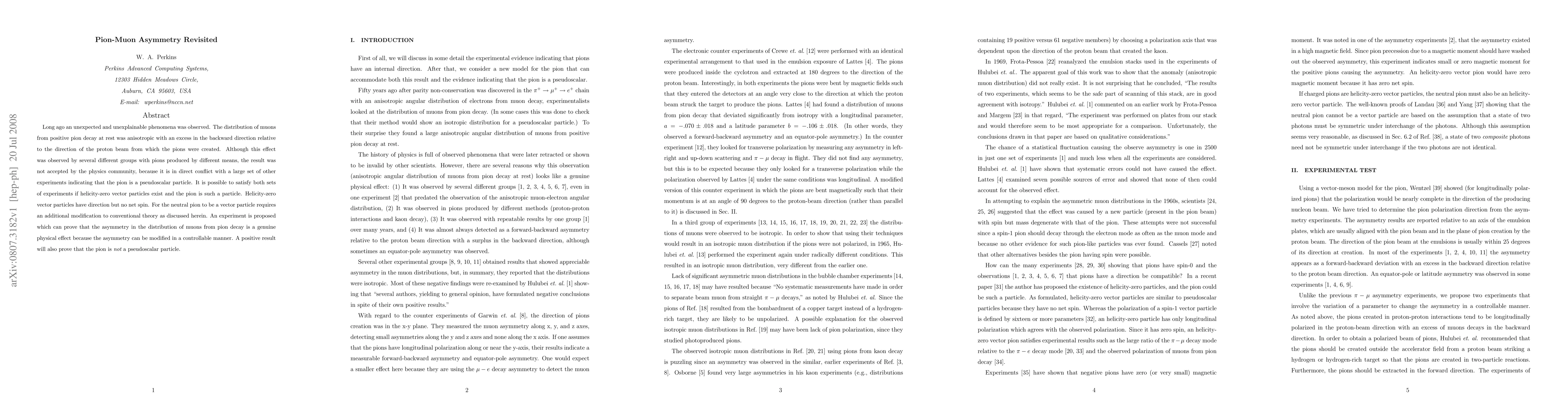 Long ago an unexpected and unexplainable phenomena was observed. The distribution of muons from positive pion decay at rest was anisotropic with an excess in the backward direction relative to the direction of the proton beam from which the pions were created. Although this effect was observed by several different groups with pions produced by different means, the result was not accepted by the physics community, because it is in direct conflict with a large set of other experiments indicating that the pion is a pseudoscalar particle. It is possible to satisfy both sets of experiments if helicity-zero vector particles exist and the pion is such a particle. Helicity-zero vector particles have direction but no net spin. For the neutral pion to be a vector particle requires an additional modification to conventional theory as discussed herein. An experiment is proposed which can prove that the asymmetry in the distribution of muons from pion decay is a genuine physical effect because the asymmetry can be modified in a controllable manner. A positive result will also prove that the pion is NOT a pseudoscalar particle.