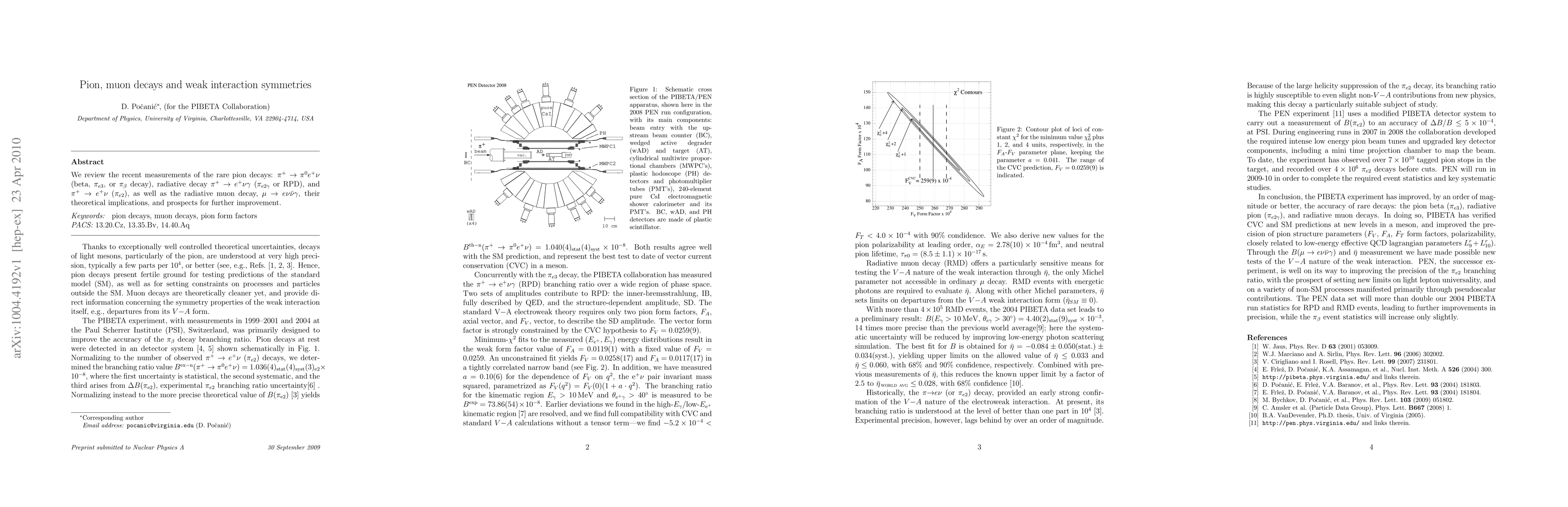 We review the recent measurements of the rare pion decays: Pi+ -> Pi0 e+ Nu [pion beta, Pi_(e3), or Pi_beta decay], radiative decay Pi+ -> e+ Nu Gamma [Pi_(e2Gamma) or RPD], and Pi+ -> e+ Nu [Pi_(e2)] decay, as well as the radiative muon decay, Mu -> e Nu Nu-bar Gamma, their theoretical implications, and prospects for further improvement.