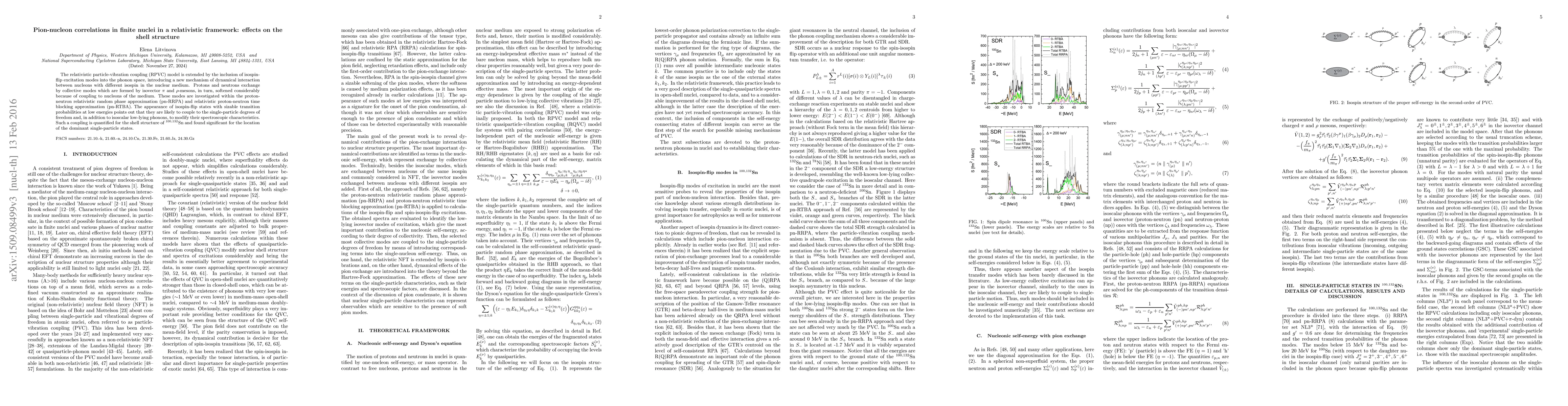 This paper investigates pion-nucleon correlations in finite nuclei using a relativistic framework, showing how spin- and isospin-flip excitations modify the shell structure. The study finds that isospin-flip states significantly affect the spectroscopic characteristics and the location of dominant single-particle states in $^{100,132}$Sn.