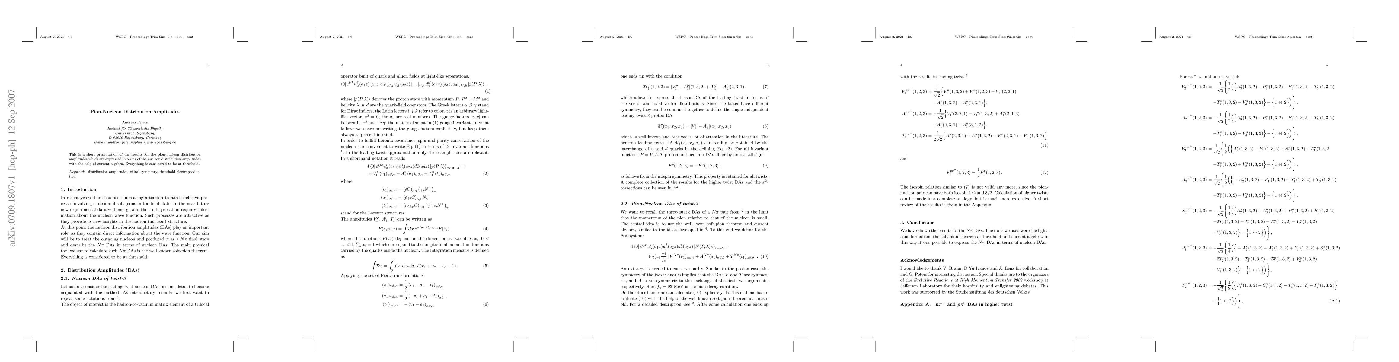 This is a short presentation of the results for the pion-nucleon distribution amplitudes which are expressed in terms of the nucleon distribution amplitudes with the help of current algebra. Everything is considered to be at threshold.