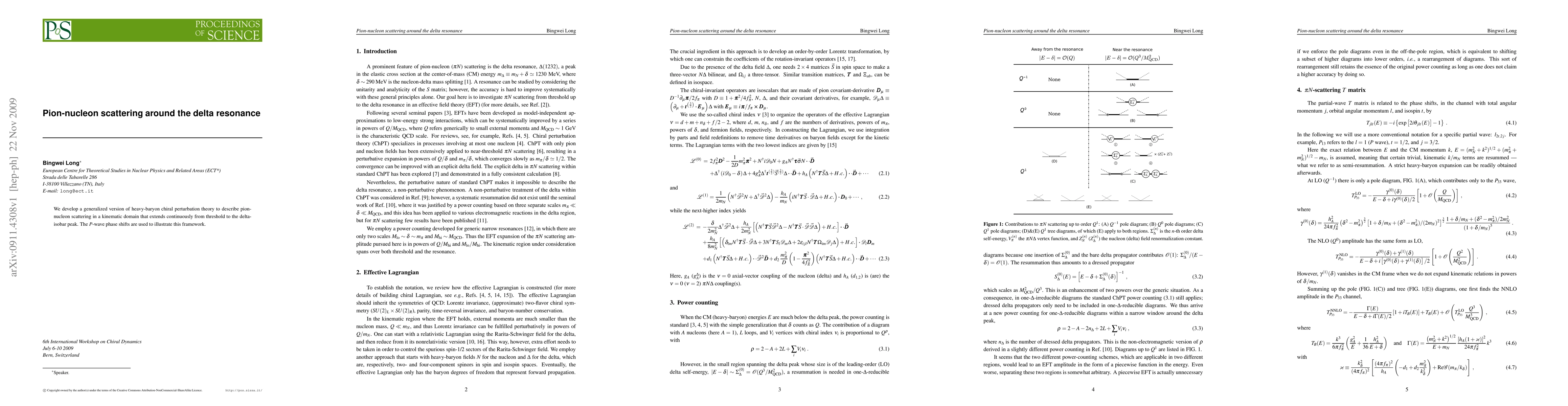The development of a generalized heavy-baryon chiral perturbation theory and a new power counting scheme for one-∆-reducible diagrams around the delta resonance.