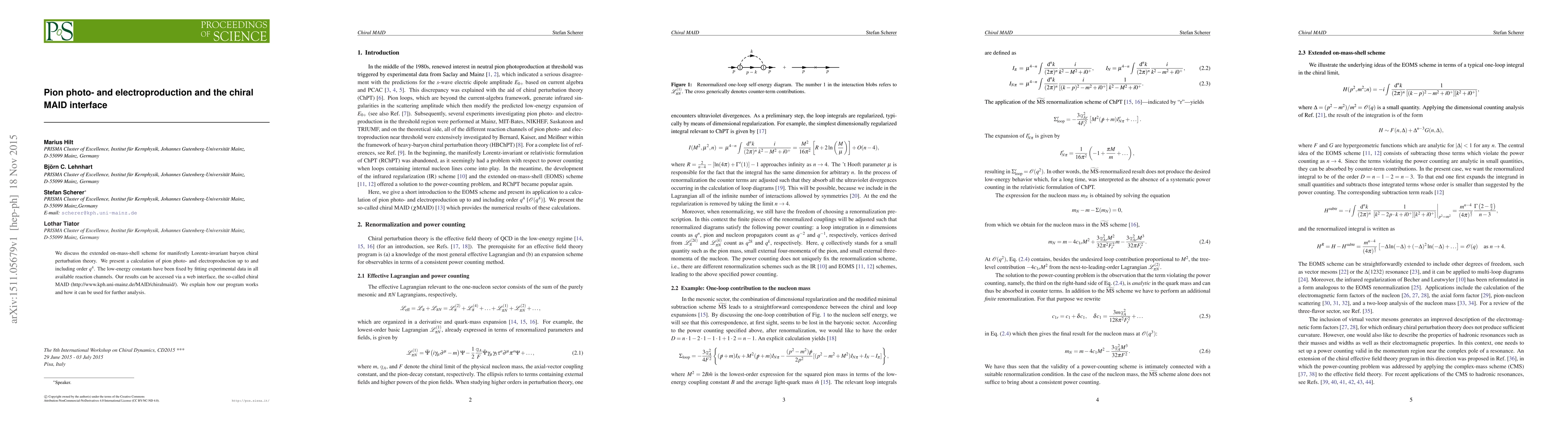 We discuss the extended on-mass-shell scheme for manifestly Lorentz-invariant baryon chiral perturbation theory. We present a calculation of pion photo- and electroproduction up to and including order $q^4$. The low-energy constants have been fixed by fitting experimental data in all available reaction channels. Our results can be accessed via a web interface, the so-called chiral MAID (http://www.kph.uni-mainz.de/MAID/chiralmaid/). We explain how our program works and how it can be used for further analysis.