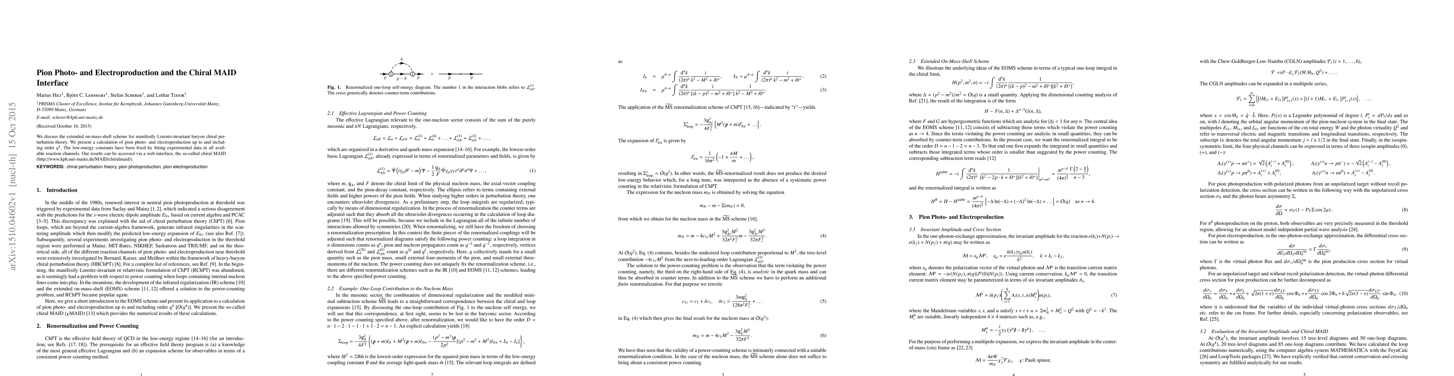 We discuss the extended on-mass-shell scheme for manifestly Lorentz-invariant baryon chiral perturbation theory. We present a calculation of pion photo- and electroproduction up to and including order $q^4$. The low-energy constants have been fixed by fitting experimental data in all available reaction channels. Our results can be accessed via a web interface, the so-called chiral MAID (http://www.kph.uni-mainz.de/MAID/chiralmaid/).