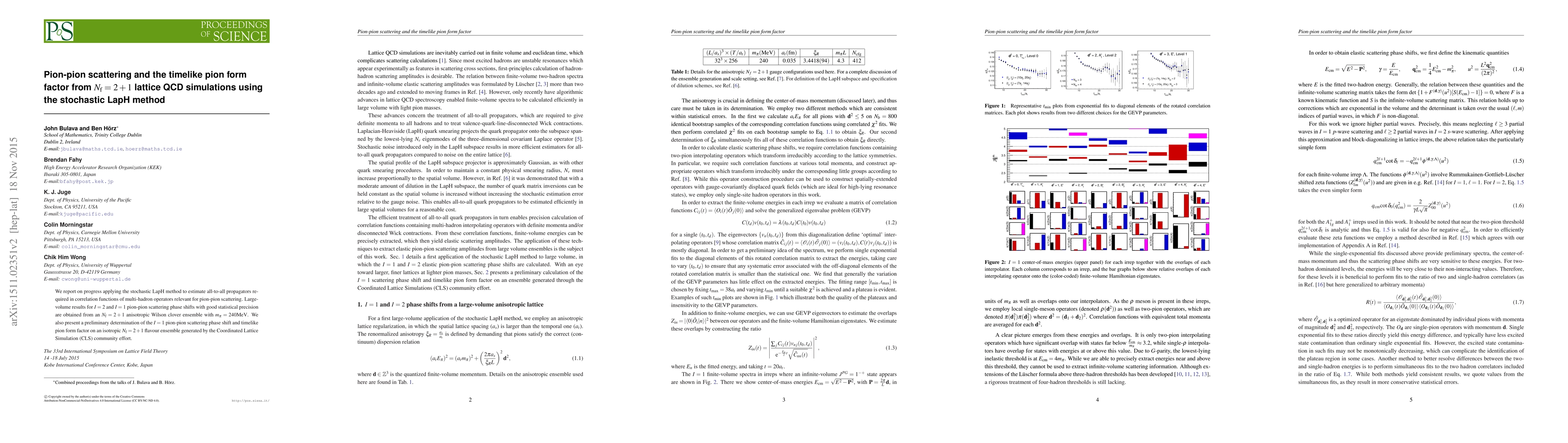 We report on progress applying the stochastic LapH method to estimate all-to-all propagators required in correlation functions of multi-hadron operators relevant for pion-pion scattering. Large-volume results for $I=2$ and $I=1$ pion-pion scattering phase shifts with good statistical precision are obtained from an $N_{\rm f} = 2+1$ anisotropic Wilson clover ensemble with $m_{\pi} = 240\mathrm{MeV}$. We also present a preliminary determination of the $I=1$ pion-pion scattering phase shift and timelike pion form factor on an isotropic $N_{\rm f}=2+1$ flavour ensemble generated by the Coordinated Lattice Simulation (CLS) community effort.