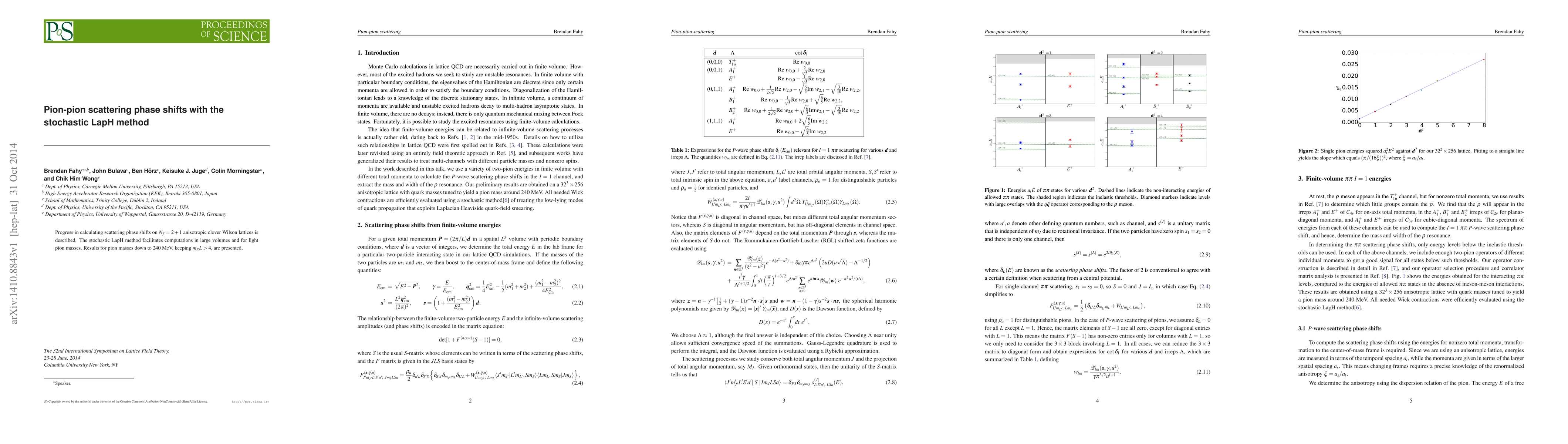 This paper presents advancements in calculating pion-pion scattering phase shifts using the stochastic LapH method on $N_f=2+1$ anisotropic clover Wilson lattices, enabling computations in large volumes and for light pion masses down to 240 MeV. The method maintains $m_\pi L > 4$ for accurate results.