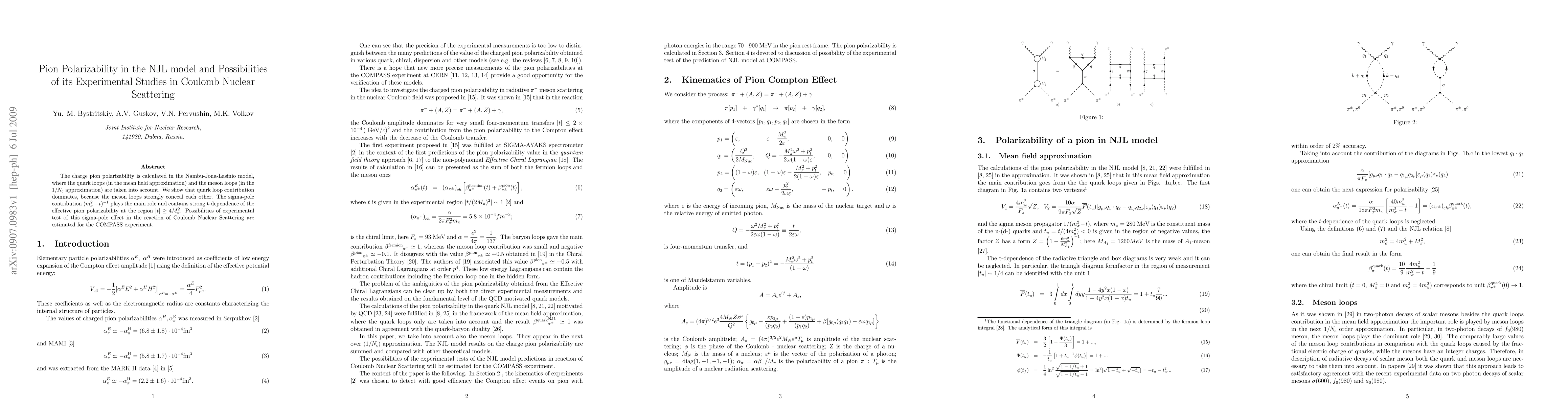 The paper calculates pion polarizability in the Nambu-Jona-Lasinio model, finding quark loops dominate due to mutual concealment of meson loops. The sigma-pole contribution shows strong t-dependence, with potential experimental testing suggested for the COMPASS experiment in Coulomb Nuclear Scattering.