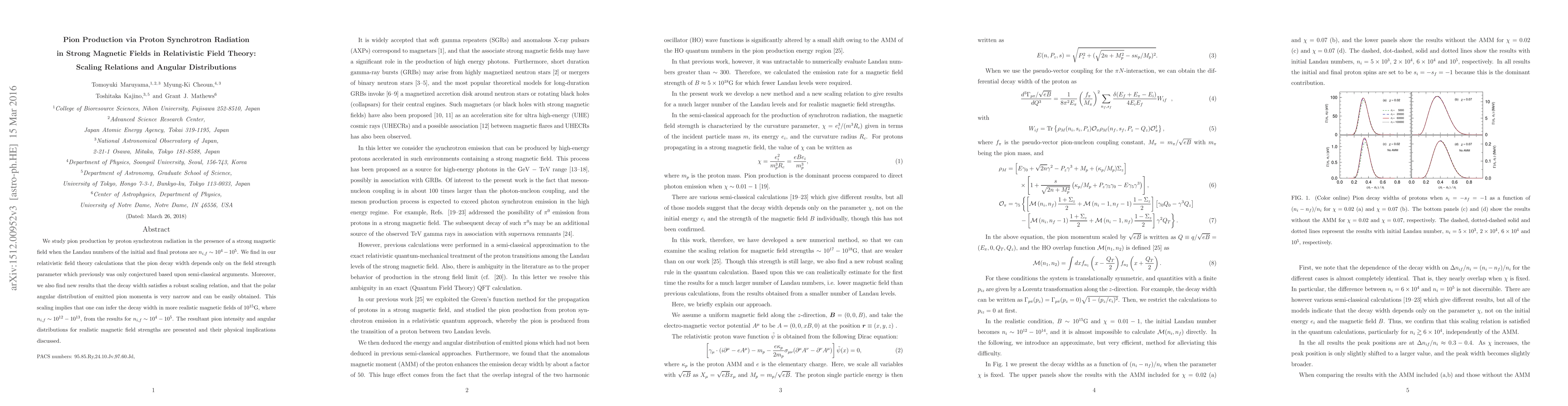 We study pion production by proton synchrotron radiation in the presence of a strong magnetic field when the Landau numbers of the initial and final protons are $n_{i,f} \sim 10^4 - 10^5$. We find in our relativistic field theory calculations that the pion decay width depends only on the field strength parameter which previously was only conjectured based upon semi-classical arguments. Moreover, we also find new results that the decay width satisfies a robust scaling relation, and that the polar angular distribution of emitted pion momenta is very narrow and can be easily obtained. This scaling implies that one can infer the decay width in more realistic magnetic fields of $10^{15}$G, where $n_{i,f} \sim 10^{12} - 10^{13}$, from the results for $n_{i,f} \sim 10^4 - 10^5$. The resultant pion intensity and angular distributions for realistic magnetic field strengths are presented and their physical implications discussed.