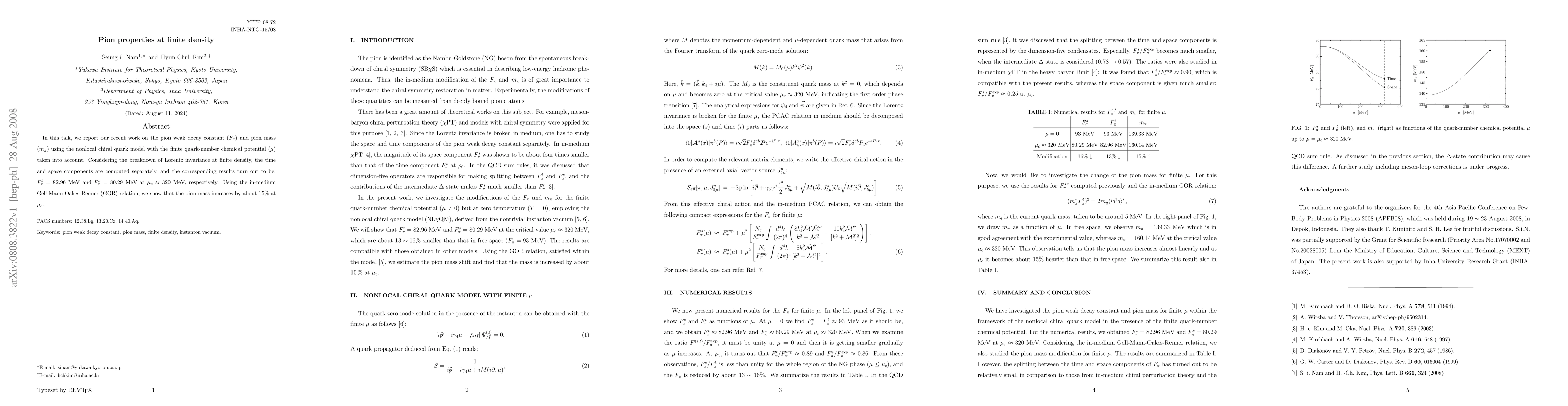 In this talk, we report our recent work on the pion weak decay constant (F_pi) and pion mass (m_pi) using the nonlocal chiral quark model with the finite quark-number chemical potential (mu) taken into account. Considering the breakdown of Lorentz invariance at finite density, the time and space components are computed separately, and the corresponding results turn out to be: F^t_pi = 82.96 MeV and F^s_pi = 80.29 MeV at mu_c ~ 320 MeV, respectively. Using the in-medium Gell-Mann Oakes-Renner (GOR) relation, we show that the pion mass increases by about 15% at mu_c.