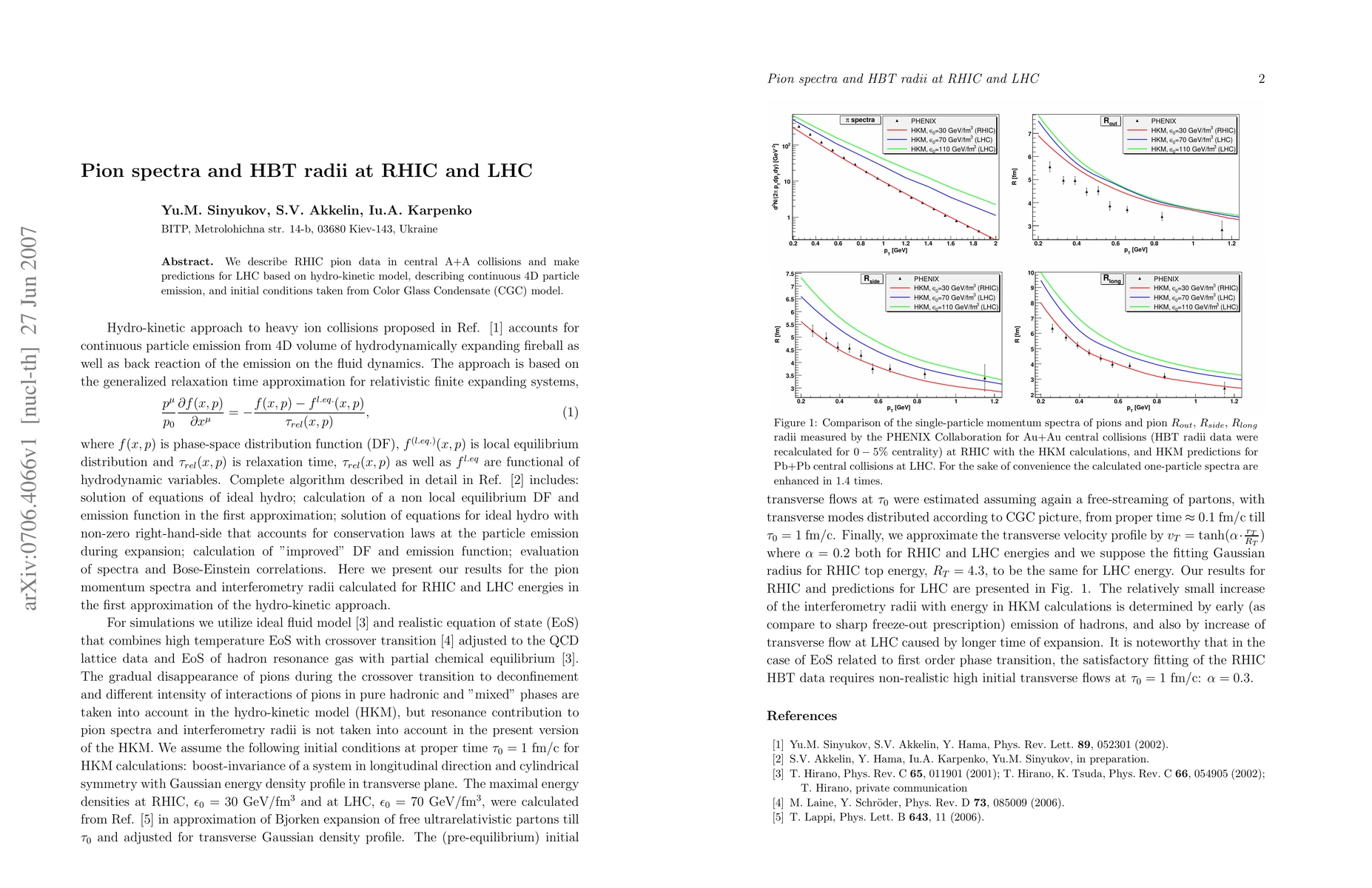 This paper analyzes pion spectra from RHIC central heavy-ion collisions and uses a hydro-kinetic model to predict LHC results, incorporating initial conditions from the Color Glass Condensate model to describe continuous 4D particle emission.