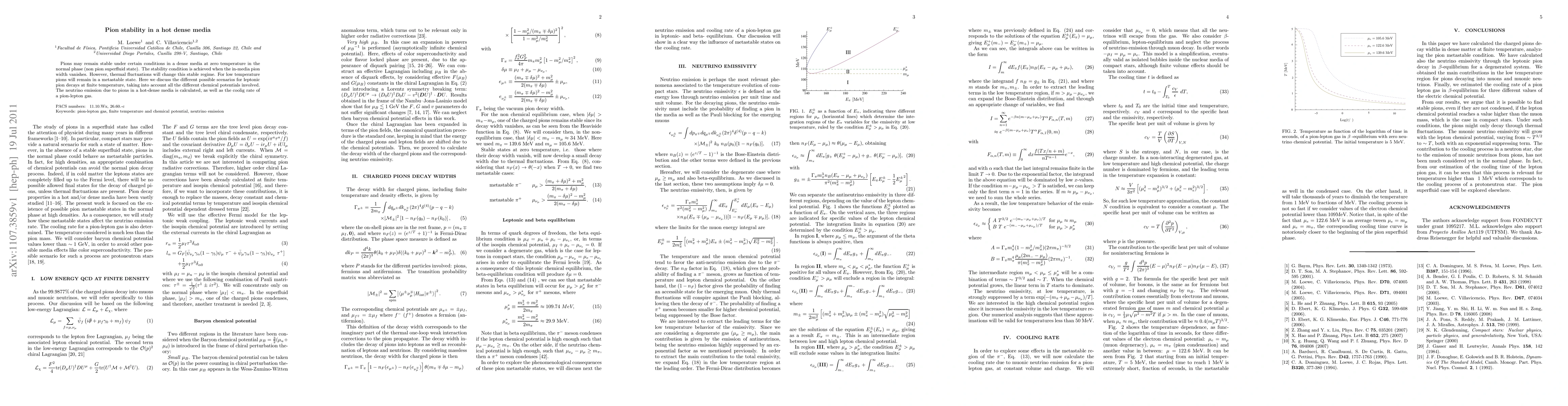 This paper explores pion stability in dense media at zero temperature, revealing conditions under which pions remain stable despite thermal fluctuations. It examines leptonic pion decay scenarios at finite temperatures and calculates neutrino emission and cooling rates for pion-lepton gas.