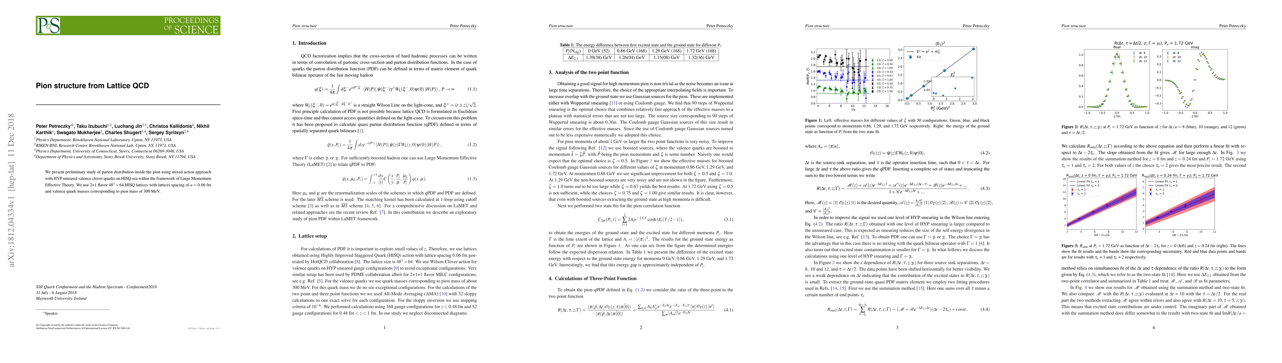 We present preliminary study of parton distribution inside the pion using mixed action approach with HYP smeared valence clover quarks on HISQ sea within the framework of Large Momentum Effective Theory. We use 2+1 flavor $48^3 \times 64$ HISQ lattices with lattices spacing of a=0.06 fm and valence quark masses corresponding to pion mass of 300 MeV.