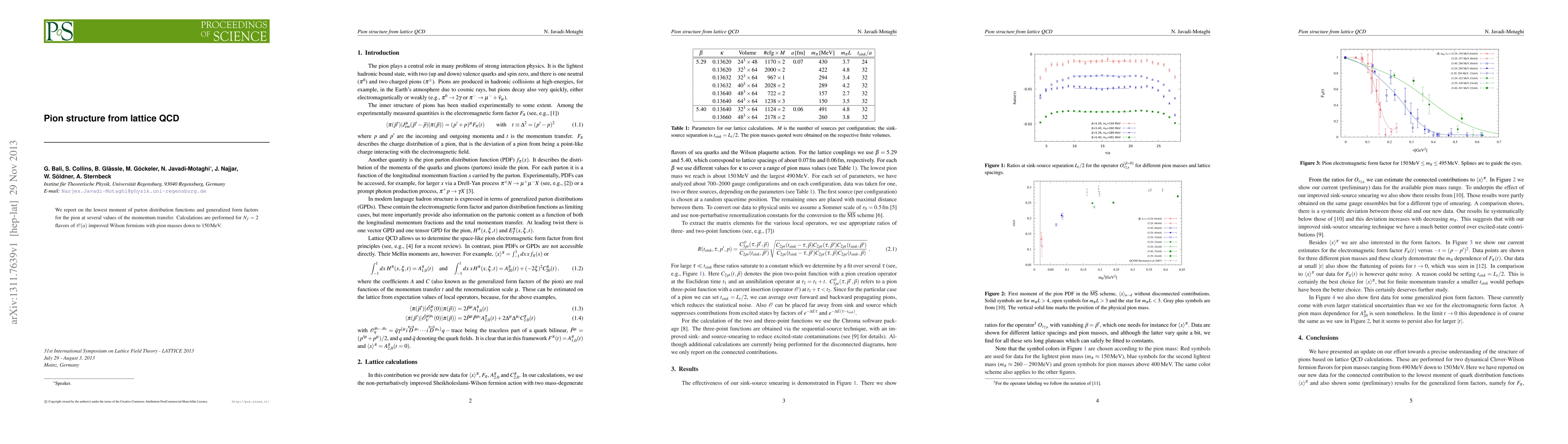 We report on the lowest moment of parton distribution functions and generalized form factors for the pion at several values of the momentum transfer. Calculations are performed for N_f=2 flavors of O(a) improved Wilson fermions with pion masses down to 150 MeV.