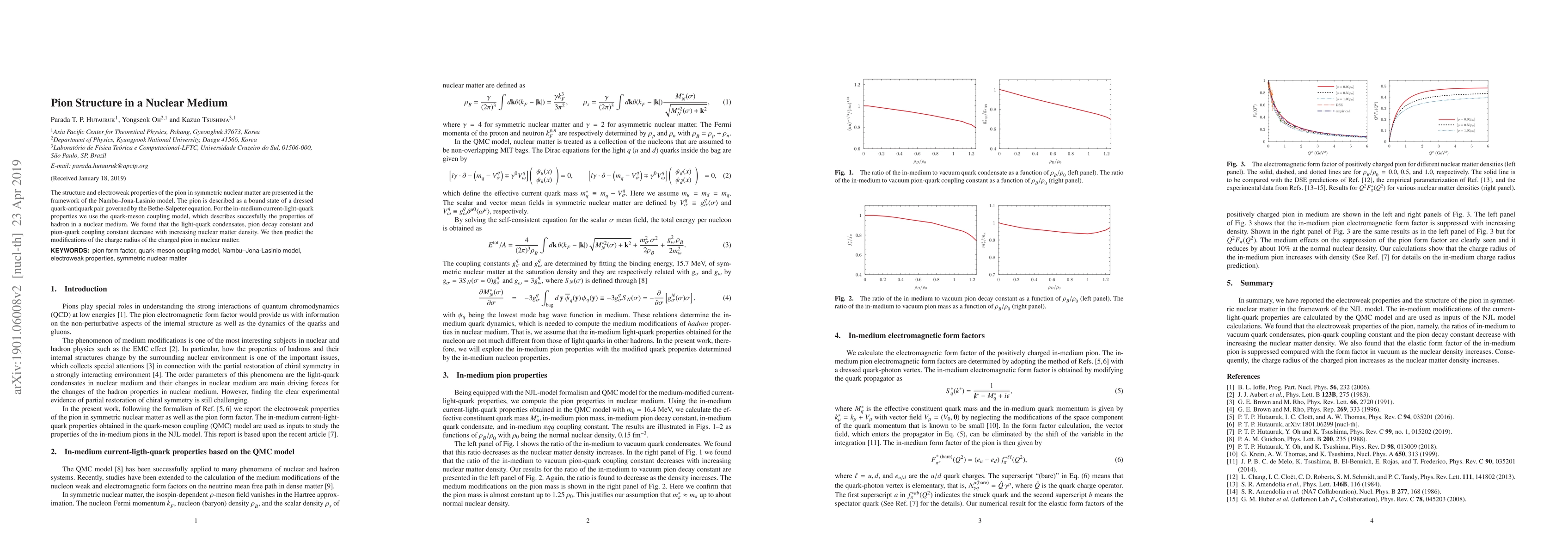 The structure and electroweak properties of the pion in symmetric nuclear matter are presented in the framework of the Nambu--Jona-Lasinio model. The pion is described as a bound state of a dressed quark-antiquark pair governed by the Bethe-Salpeter equation. For the in-medium current-light-quark properties we use the quark-meson coupling model, which describes successfully the properties of hadron in a nuclear medium. We found that the light-quark condensates, the pion decay constant and pion-quark coupling constant decrease with increasing nuclear matter density. We then predict the modifications of the charge radius of the charged pion in nuclear matter.