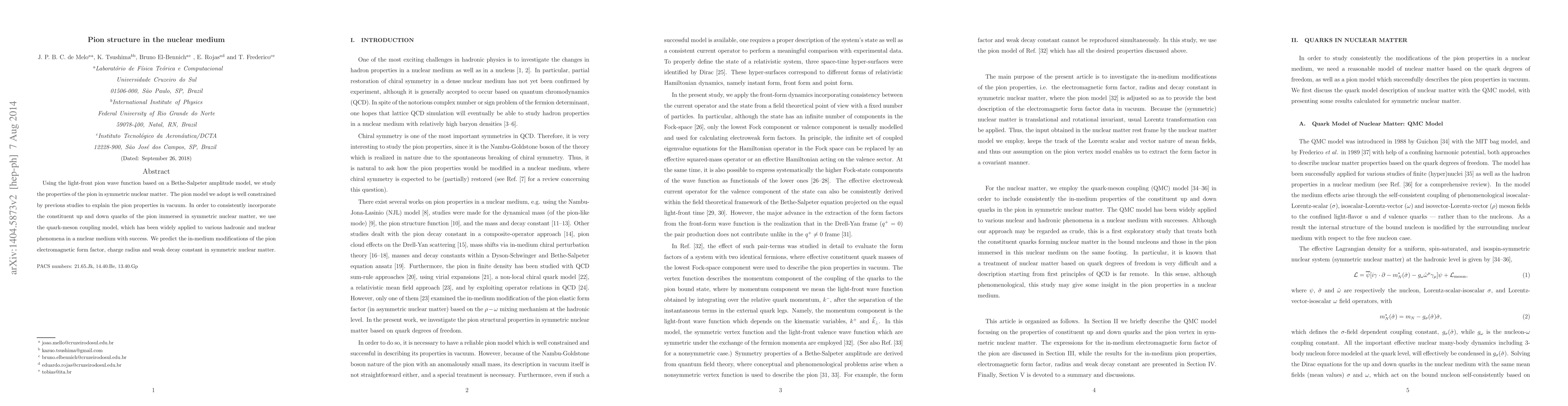 Using the light-front pion wave function based on a Bethe-Salpeter amplitude model, we study the properties of the pion in symmetric nuclear matter. The pion model we adopt is well constrained by previous studies to explain the pion properties in vacuum. In order to consistently incorporate the constituent up and down quarks of the pion immersed in symmetric nuclear matter, we use the quark-meson coupling model, which has been widely applied to various hadronic and nuclear phenomena in a nuclear medium with success. We predict the in-medium modifications of the pion lectromagnetic form factor, charge radius and weak decay constant in symmetric nuclear matter.