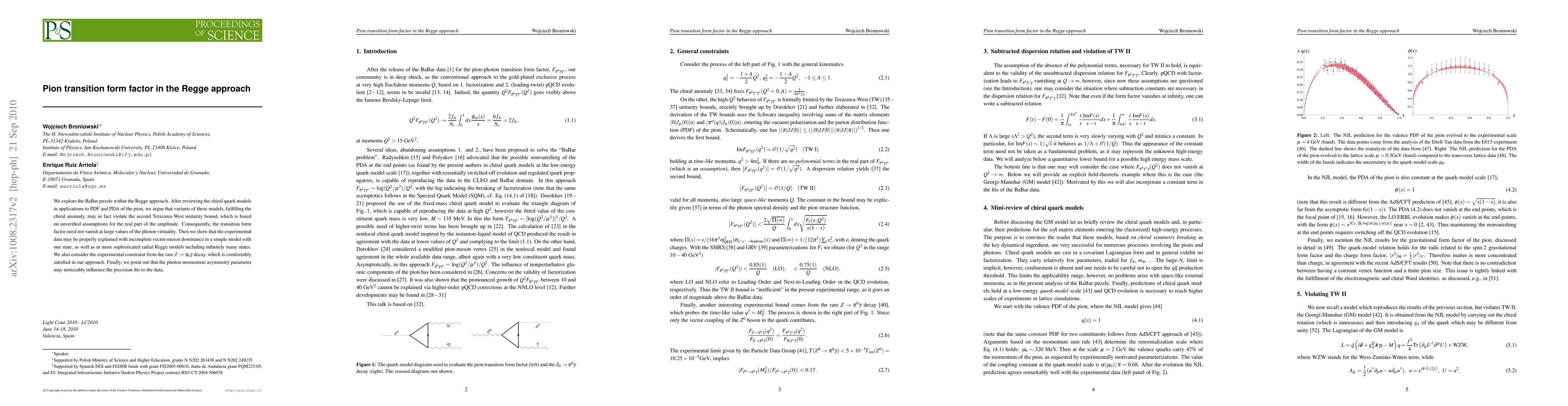 This paper investigates the BaBar puzzle using the Regge approach, suggesting that chiral quark models may violate the second Terazawa-West unitarity bound, leading to a non-vanishing pion transition form factor at high photon virtuality. It demonstrates that experimental data can be explained through incomplete vector-meson dominance and radial Regge models.