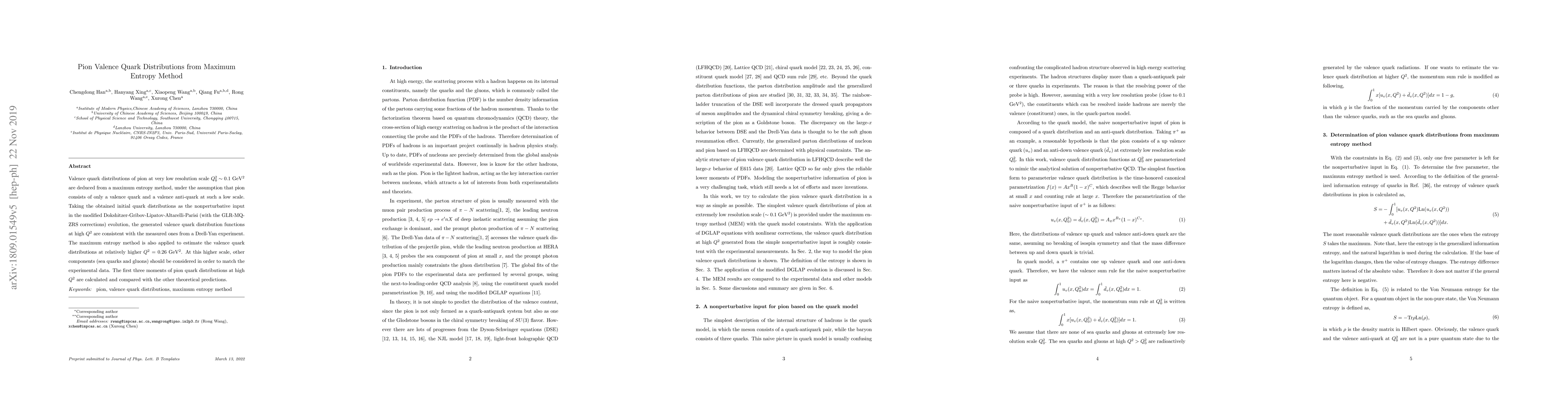 The research employs the Maximum Entropy Method (MEM) to deduce pion valence quark distributions at a low resolution scale $Q^{2}_0 \sim 0.1~GeV^2$, assuming a valence quark-antiquark pair. The Dokshitzer-Gribov-Lipatov-Altarelli-Parisi (DGLAP) equations with GLR-MQ-ZRS corrections are used for evolution to high $Q^2$, comparing with Drell-Yan experimental data.