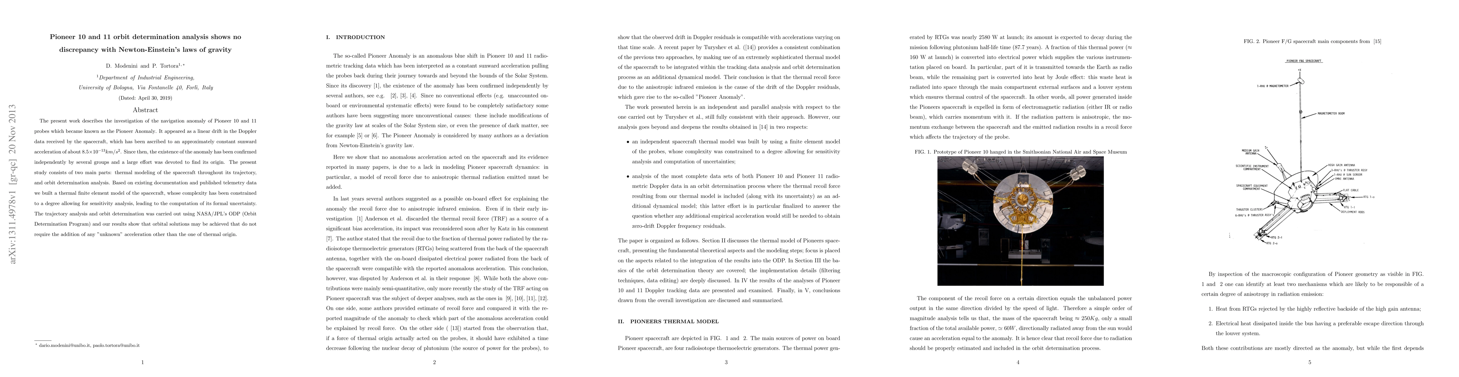 The present work describes the investigation of the navigation anomaly of Pioneer 10 and 11 probes which became known as the Pioneer Anomaly. It appeared as a linear drift in the Doppler data received by the spacecraft, which has been ascribed to an approximately constant sunward acceleration of about $8.5 \times 10^{-13} km/s^2$. Since then, the existence of the anomaly has been confirmed independently by several groups and a large effort was devoted to find its origin. The present study consists of two main parts: thermal modeling of the spacecraft throughout its trajectory, and orbit determination analysis. Based on existing documentation and published telemetry data we built a thermal finite element model of the spacecraft, whose complexity has been constrained to a degree allowing for sensitivity analysis, leading to the computation of its formal uncertainty. The trajectory analysis and orbit determination was carried out using NASA/JPL's ODP (Orbit Determination Program) and our results show that orbital solutions may be achieved that do not require the addition of any "unknown" acceleration other than the one of thermal origin.