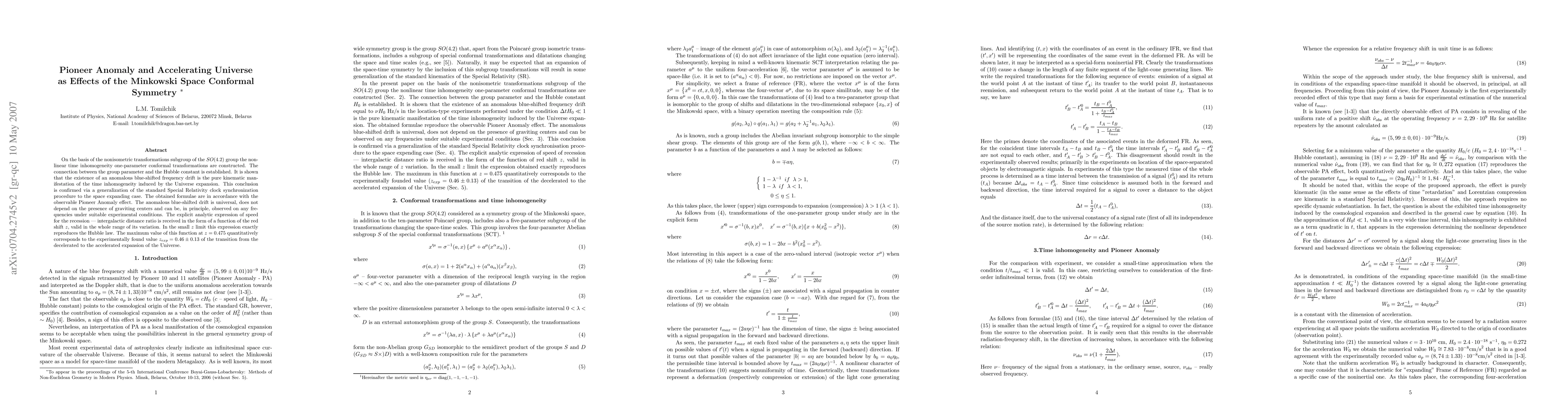 On the basis of the nonisometric transformations subgroup of the SO(4.2) group, the nonlinear time inhomogeneity one-parameter conformal transformations are constructed. The connection between the group parameter and the Hubble constant H0 is established. It is shown that the existence of an anomalous blue-shifted frequency drift is a pure kinematic manifestation of the time inhomogeneity induced by the Universe expansion. This conclusion is confirmed via a generalization of the standard Special Relativity clock synchronization procedure to the space expanding case. The obtained formulae are in accordance with the observable Pioneer Anomaly effect. The anomalous blue-shifted drift is universal, does not depend on the presence of graviting centers and can be, in principle, observed on any frequencies under suitable experimental conditions. The explicit analytic expression for the speed of recession--intergalactic distance ratio is obtained in the form of a function of the red shift z valid in the whole range of its variation. In the small z limit this expression exactly reproduces the Hubble law. The maximum value of this function at z=0.475 quantitatively corresponds to the experimentally found value z(exp) = 0.46 +/- 0.13 of the transition from the decelerated to the accelerated expansion of the Universe.