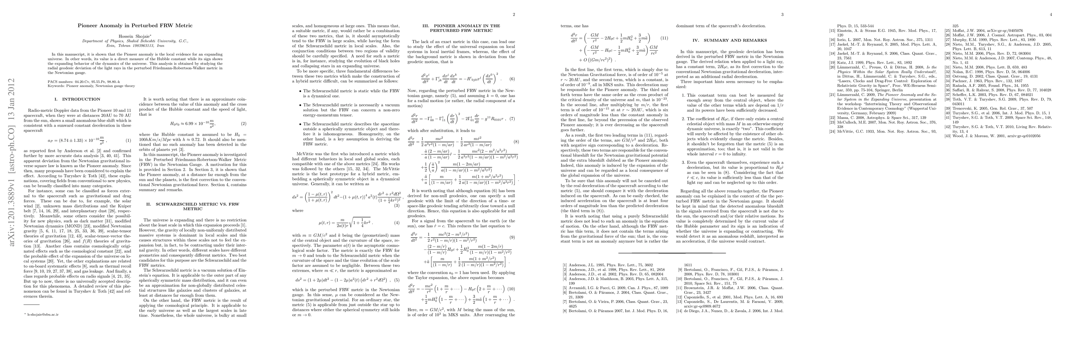 In this manuscript, it is shown that the Pioneer anomaly is the local evidence for an expanding universe. In other words, its value is a direct measure of the Hubble constant while its sign shows the expanding behavior of the dynamics of the universe. This analysis is obtained by studying the radial geodesic deviation of the light rays in the perturbed Friedmann-Robertson-Walker metric in the Newtonian gauge.