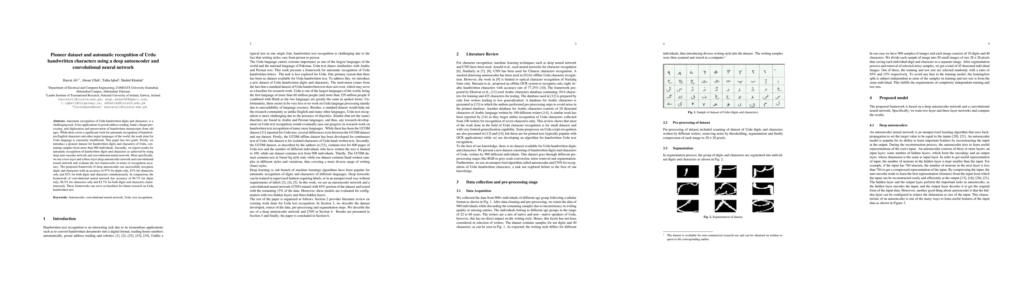 This paper introduces a pioneer dataset for Urdu handwritten digits and characters, aiming to address the insufficient research on Urdu language recognition. It employs deep autoencoder and convolutional neural network frameworks to achieve recognition accuracies of 97% for digits, 81% for characters, and 82% for both, with the convolutional neural network showing slightly better performance.